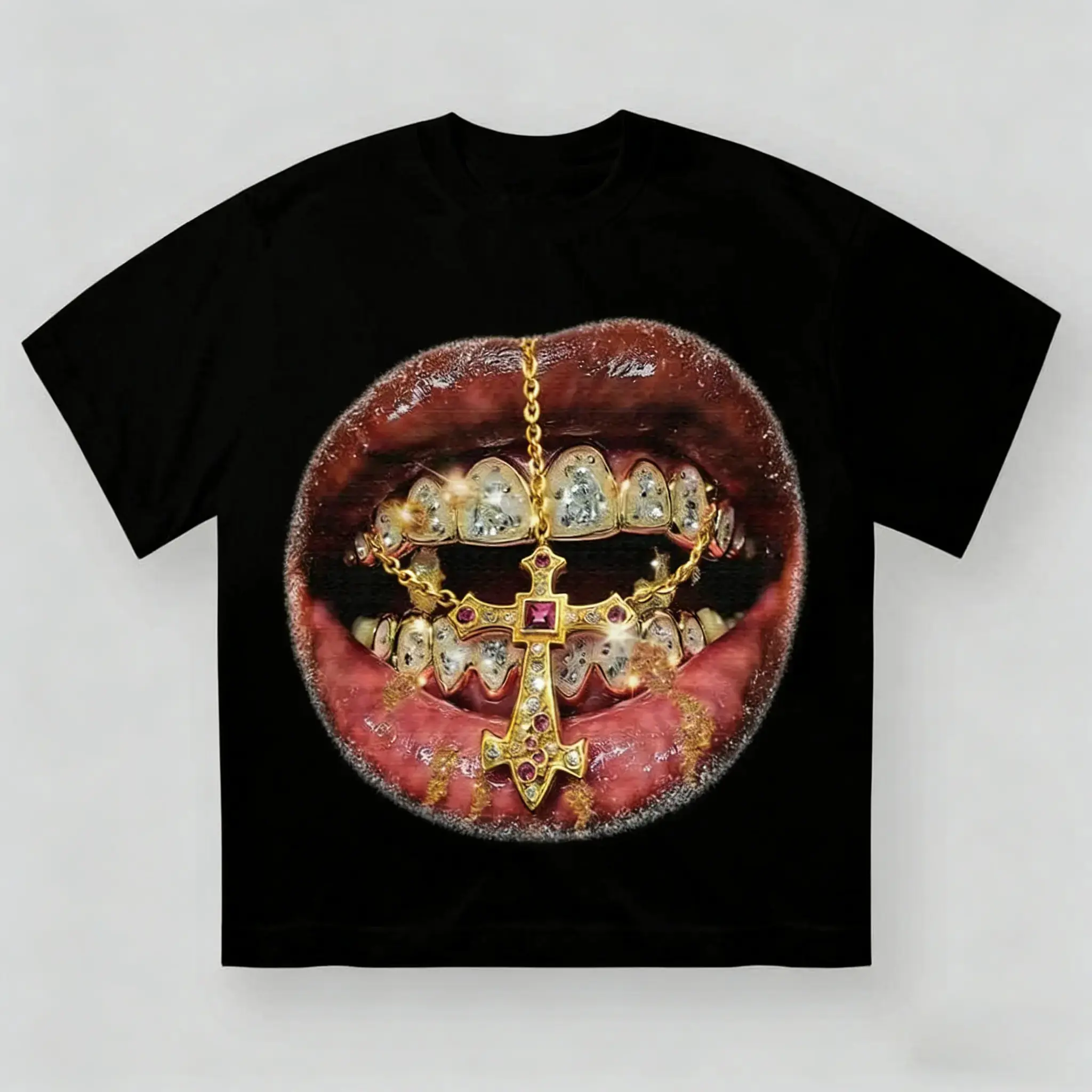 2026 Viral Iced Out Grillz Cross Graphic T-Shirt, Men's Hip Hop Streetwear Tee, Bling Diamond Grill Cotton Top