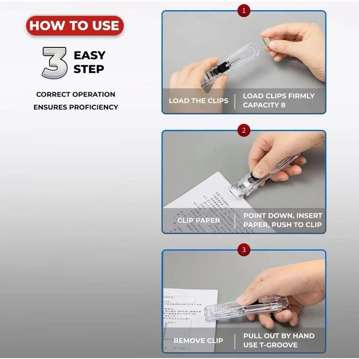 Quick & Clean Binding:The Paper Clam Clip Dispenser simplifies document binding in three easy steps: insert the clip, align the papers, and press to secure. The smooth stainless steel clips glide effortlessly, preventing paper jams or misalignment. Unlike traditional staplers, theres no risk of misfires or leftover metal bits, ensuring a tidy, professional finish every time