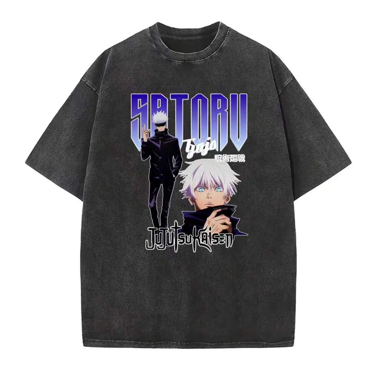 Rep the strongest jujutsu sorcerer Satoru Gojo with this stunning vintage-style bootleg tee! Featuring a striking dual-portrait illustration of Gojo in his iconic high collar uniform and blindfold, paired with bold gradient text SATORU GOJO, the Japanese title (Jujutsu Kaisen), and stylized Jujutsu Kaisen logo. This shirt captures the confident, overwhelming power of the strongest sorcerer, one of the most beloved characters in Jujutsu Kaisen history. Ideal for JJK stans, anime fans, or anyone who loves vintage anime streetwear.