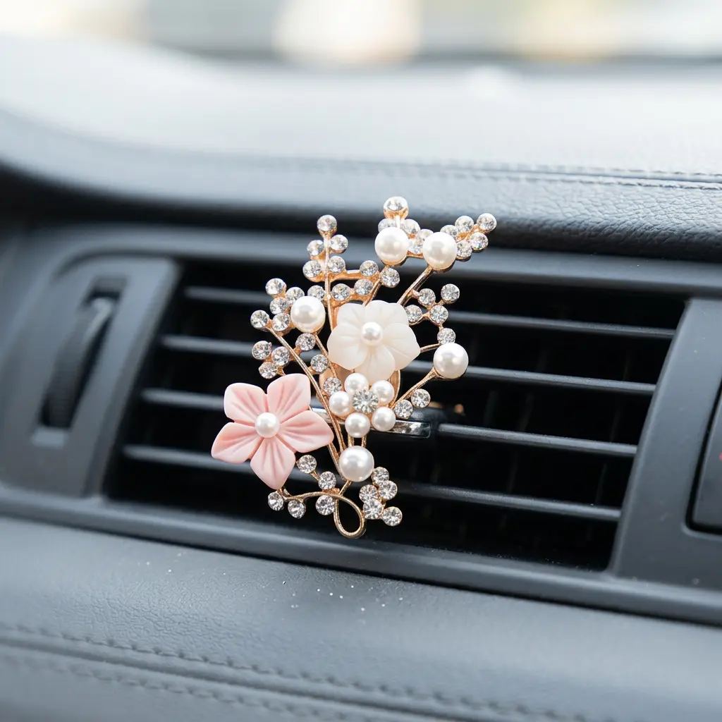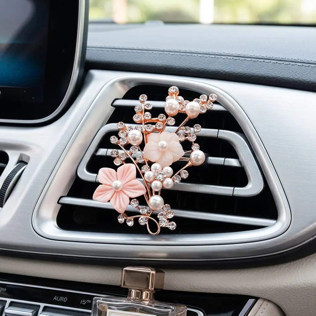 Sparkling Rhinestone Pearl Car Air Vent Freshener, Floral Auto Diffuser Clip,Cute Car Interior Decor for Women