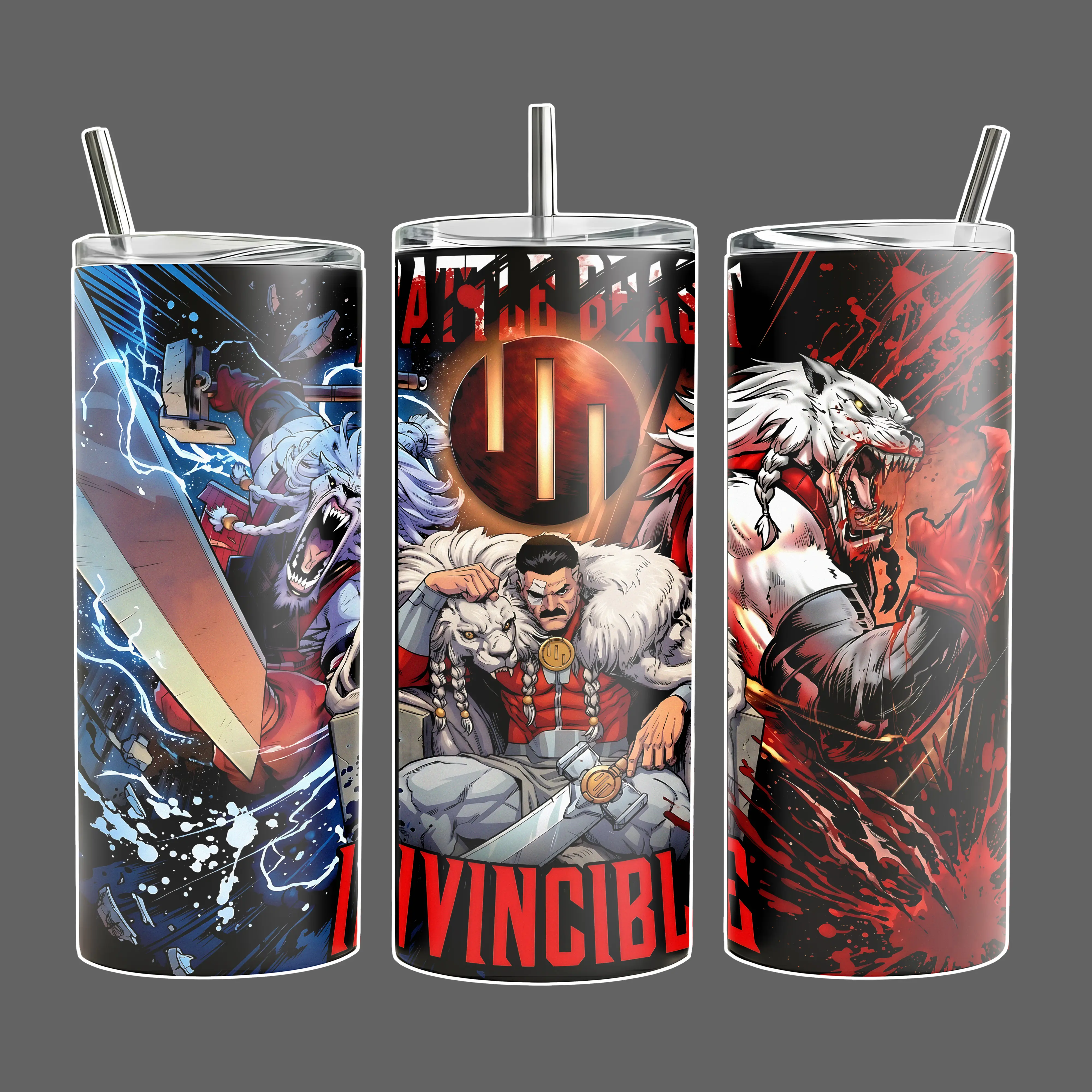 Invincible Battle Beast vs Thragg Comic Wrap Stainless Steel Insulated Travel Tumbler With Handle Straw Lid 20oz 40oz Full Wrap Blood Clash Design