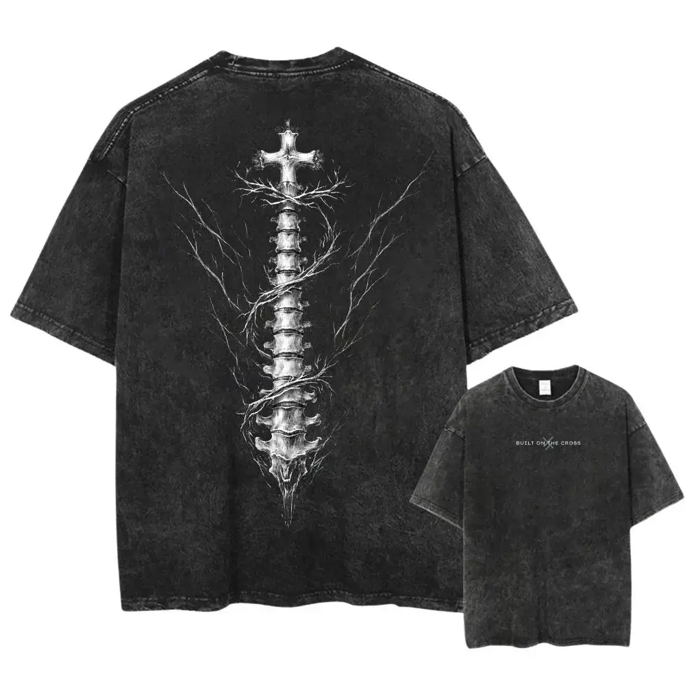 Christian Built On The Cross Spine Skeleton Graphic T-Shirt, Vintage Washed Distressed Oversized Tee, Gothic Faith Streetwear For Men & Women, Dark Aesthetic Top