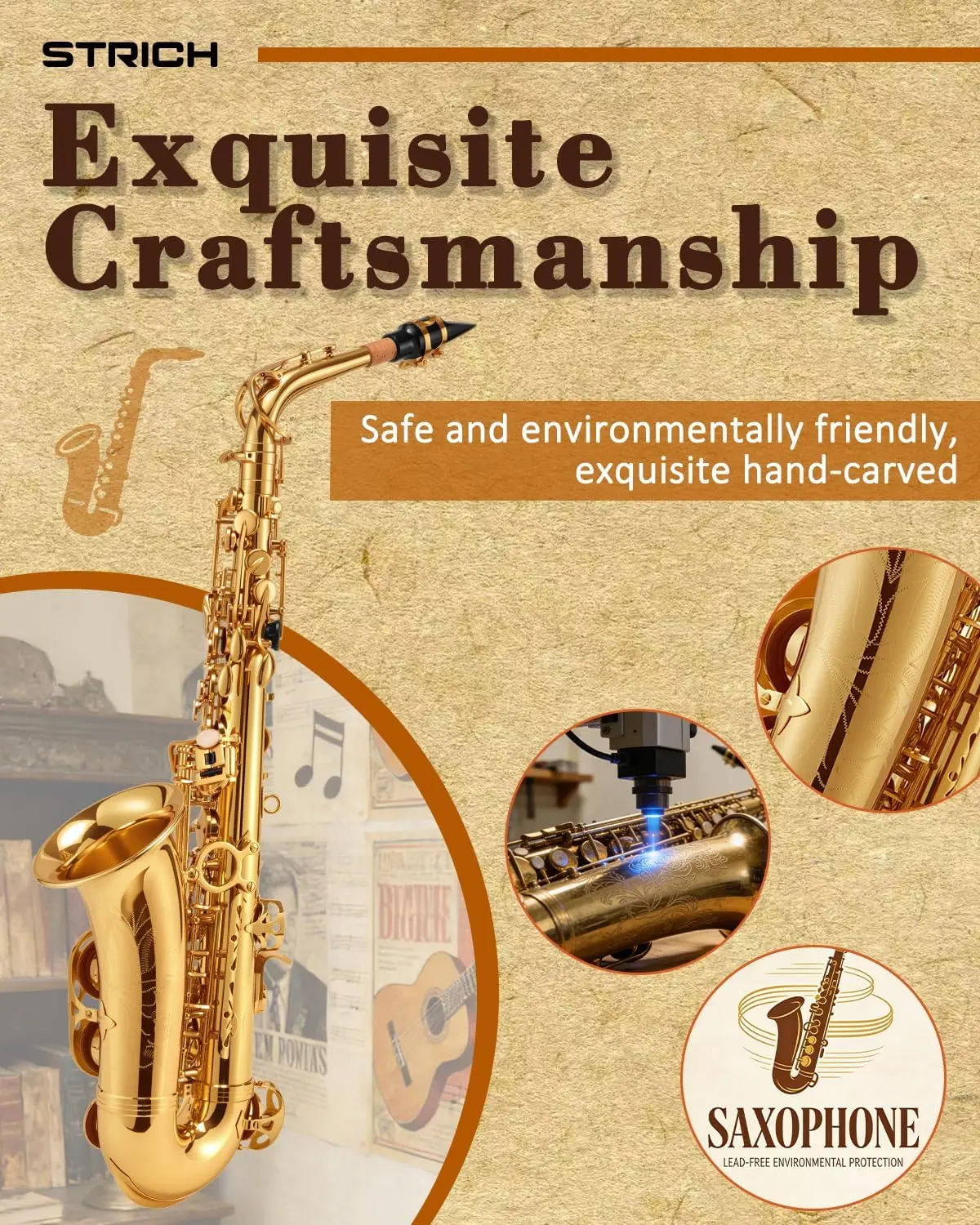 ·Complete Beginner Starter Kit: This all-in-one set includes everything a new saxophonist needs to start playing: a hard case, sax stand, genuine leather strap, mouthpiece, replacement reeds, cleaning cloth, and gloves. It’s the perfect, hassle-free package for students and beginners to begin their musical journey.