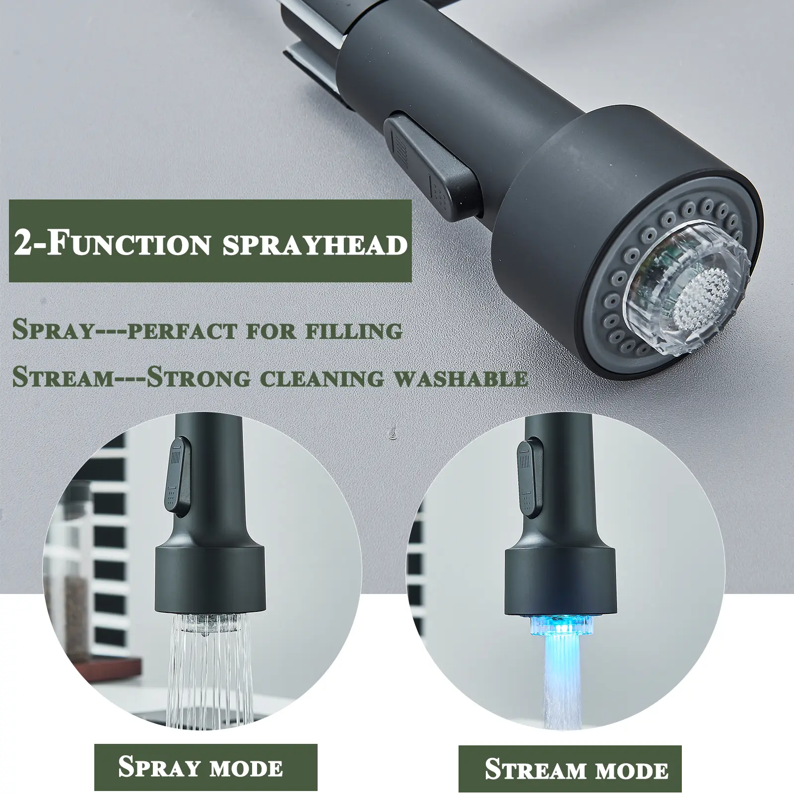 The pull-down spray head features 2 functional modes (stream & spray) to meet all your kitchen needs, from filling pots to power-washing stuck-on food residues. The high-pressure spring coil design allows smooth retraction, while the 360° swivel spout ensures full sink coverage, making cleaning corners and large cookware effortless.