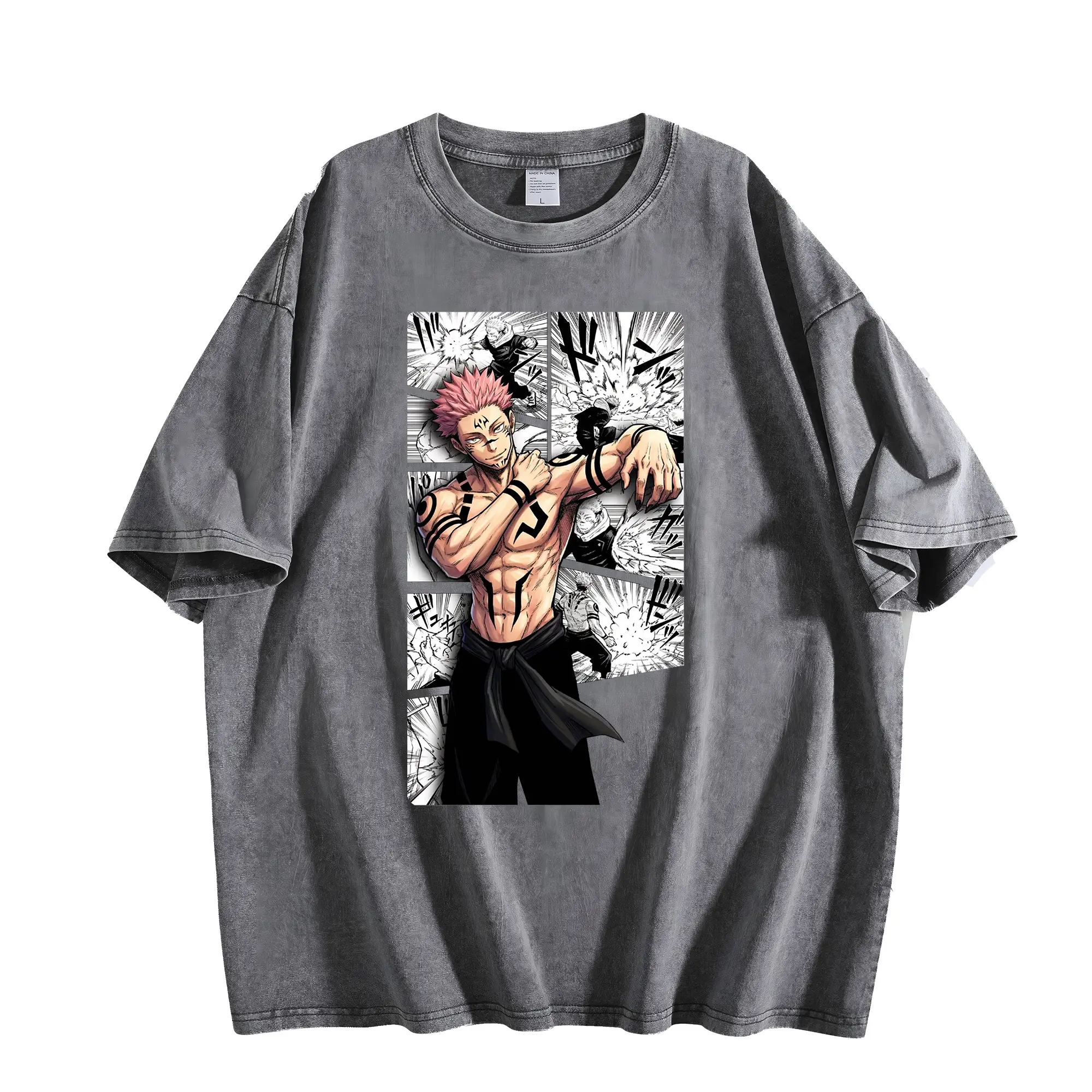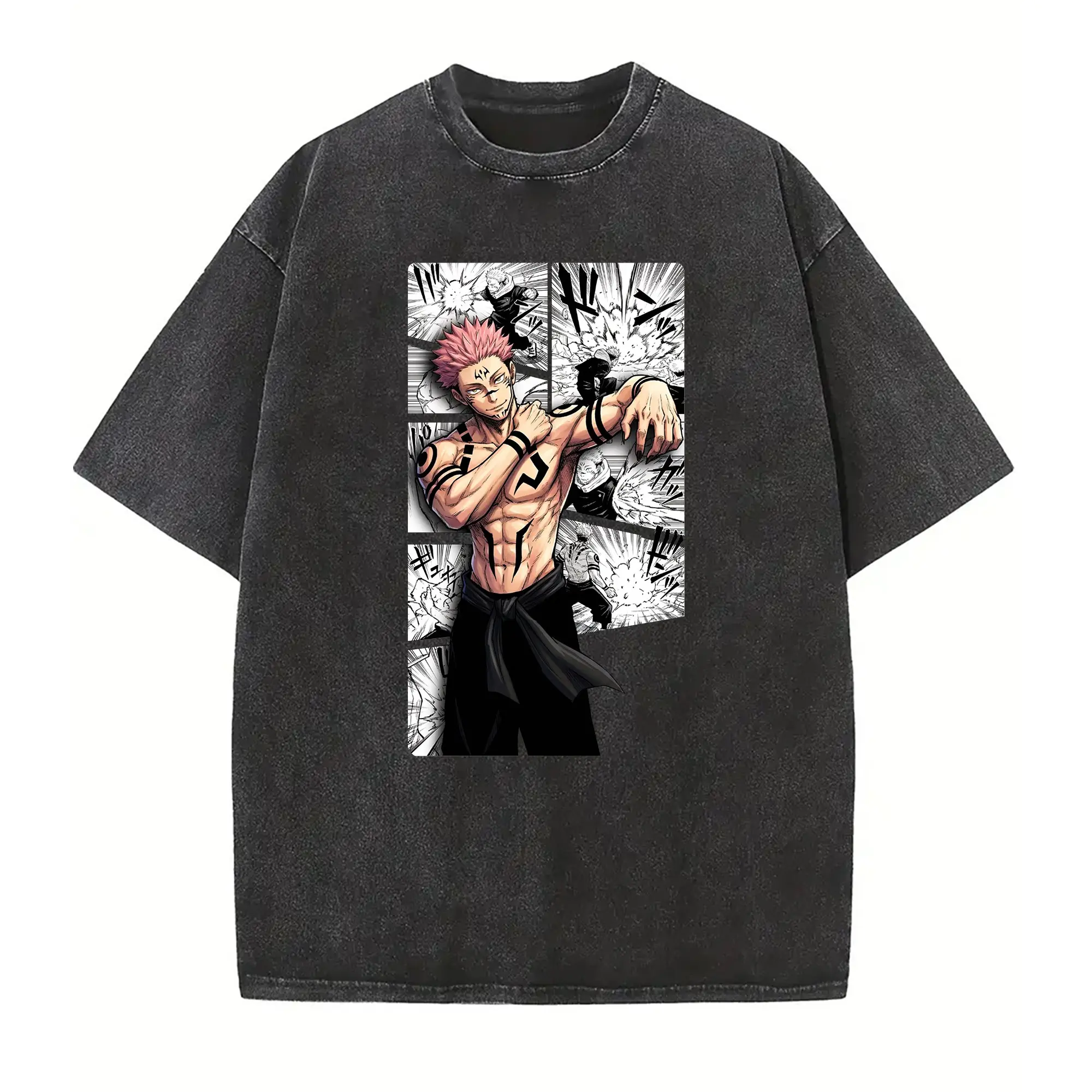 Rep the iconic Jujutsu Kaisen character Ryomen Sukuna, the "King of Curses", with this stunning vintage-style action tee! Featuring a striking illustration of Sukuna in his true, muscular form, surrounded by dynamic manga panel collages and explosion effects. This shirt captures the raw, overwhelming power of the strongest curse in Jujutsu Kaisen history. Ideal for JJK stans, anime fans, or anyone who loves vintage anime streetwear.