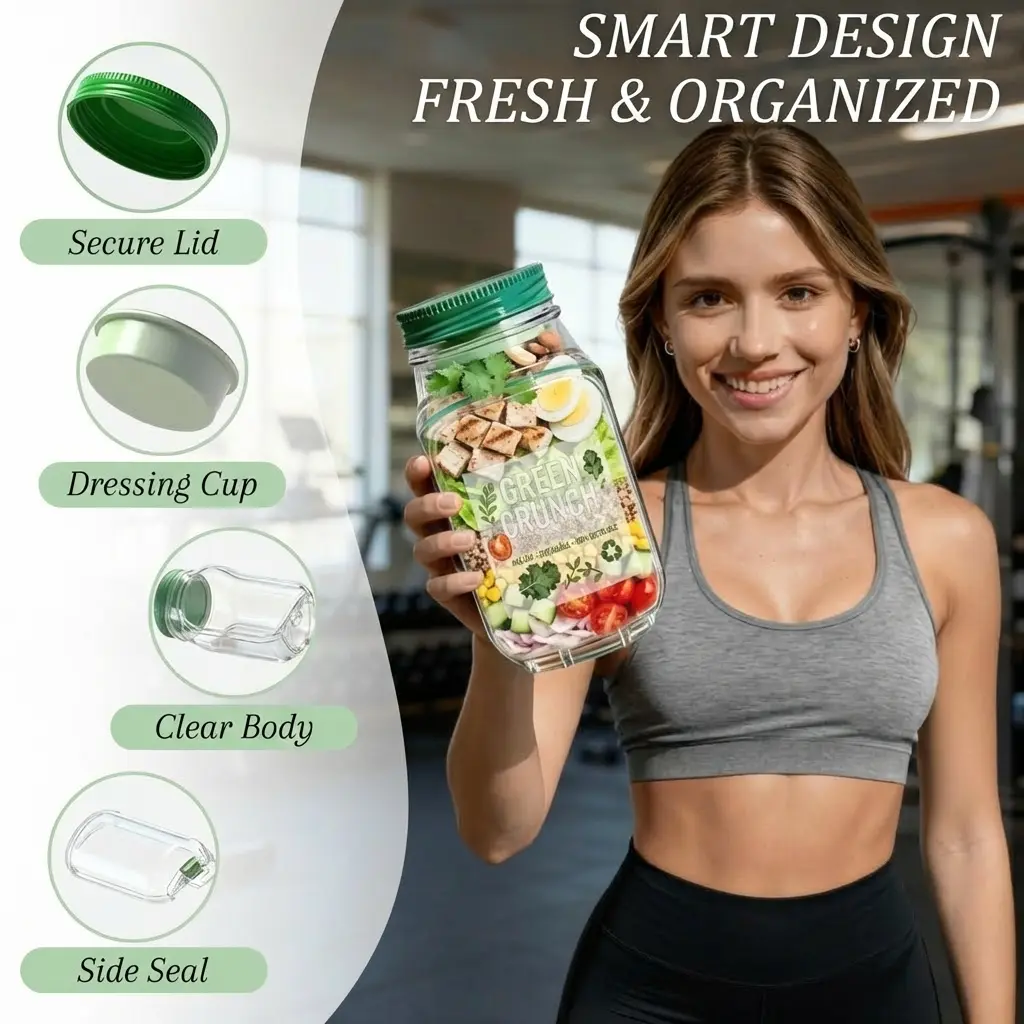 Portable Salad Jar Mason Jar, Side Opening Lunch Container with Leakproof Dressing Cup, Healthy Meal Prep for Gym Work Travel