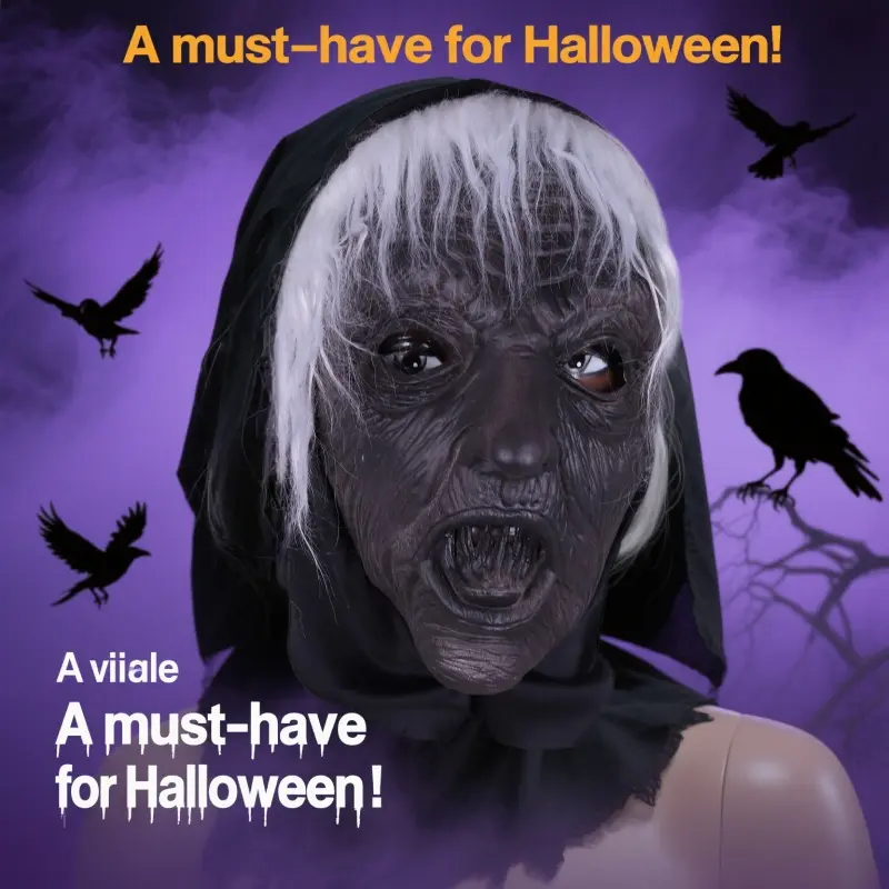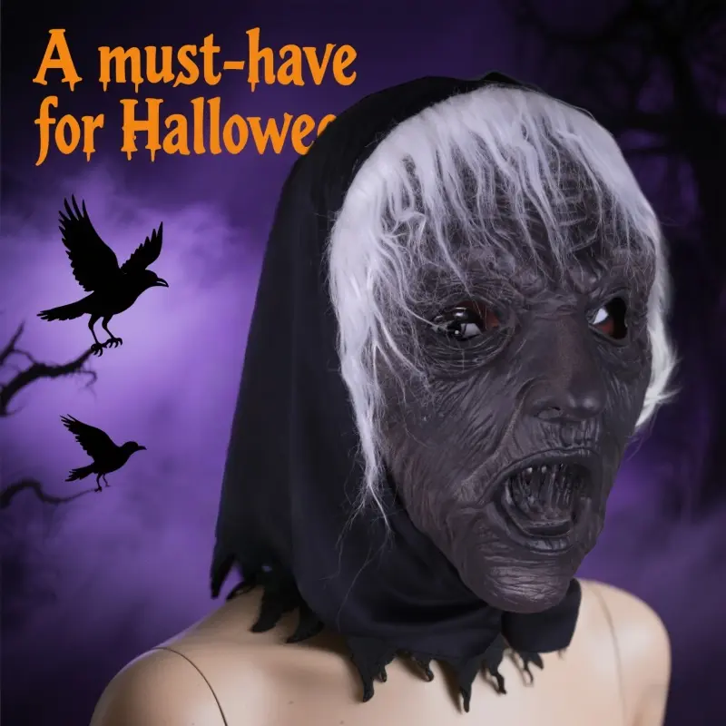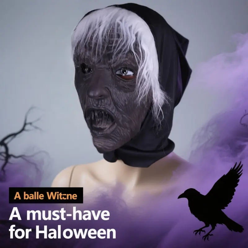 This full latex mask is inspired by a scary old witch/wizard and crafted with high realism: deep gray withered skin, deep wrinkles and folds, sharp yellow fangs, fluffy white wig, paired with a black fabric headscarf built-in; every detail is meticulously rendered, perfectly recreating the evil demeanor of the horror witch. Upon wearing, it instantly transforms into a "terrifying witch." Whether for Halloween horror looks or haunted house NPCs, it instantly creates an extreme spooky atmosphere and becomes the center of attention!