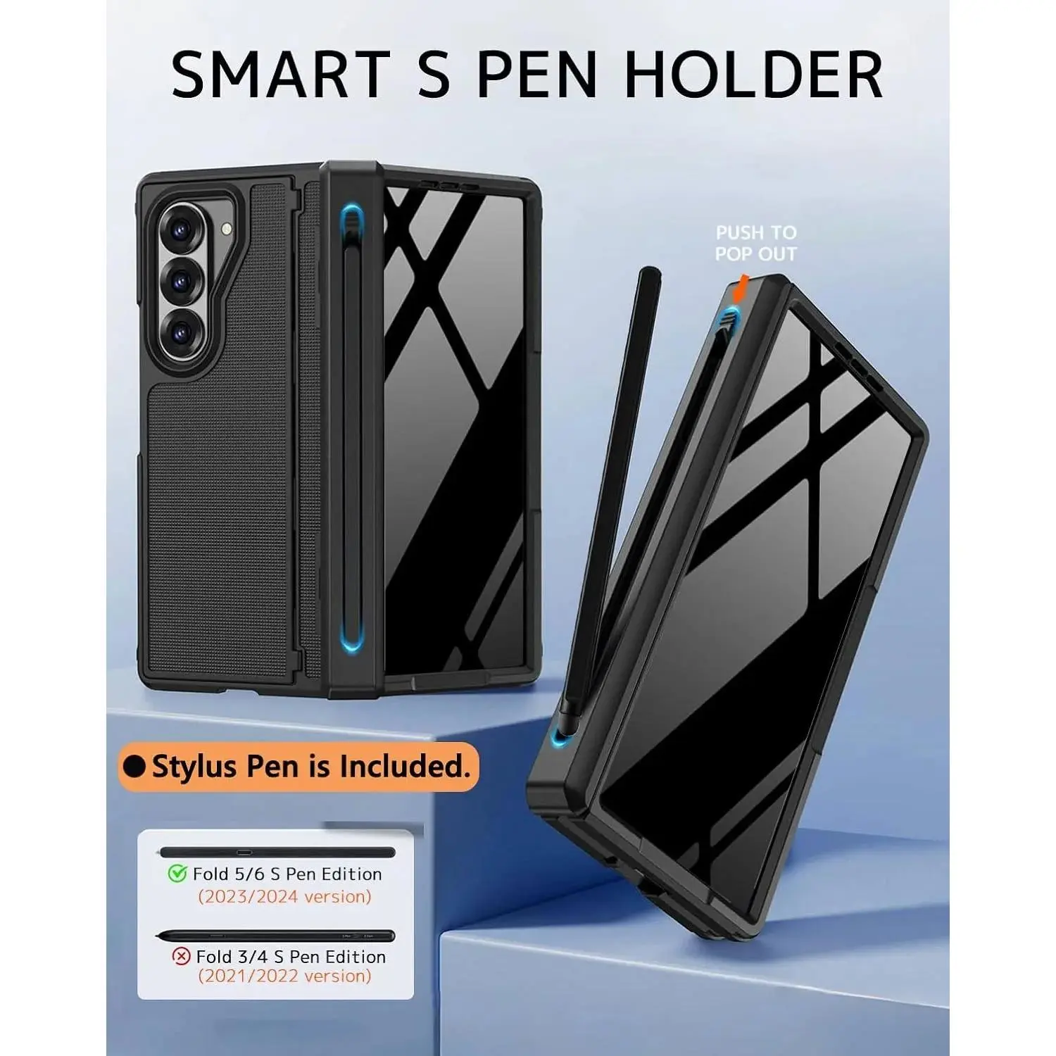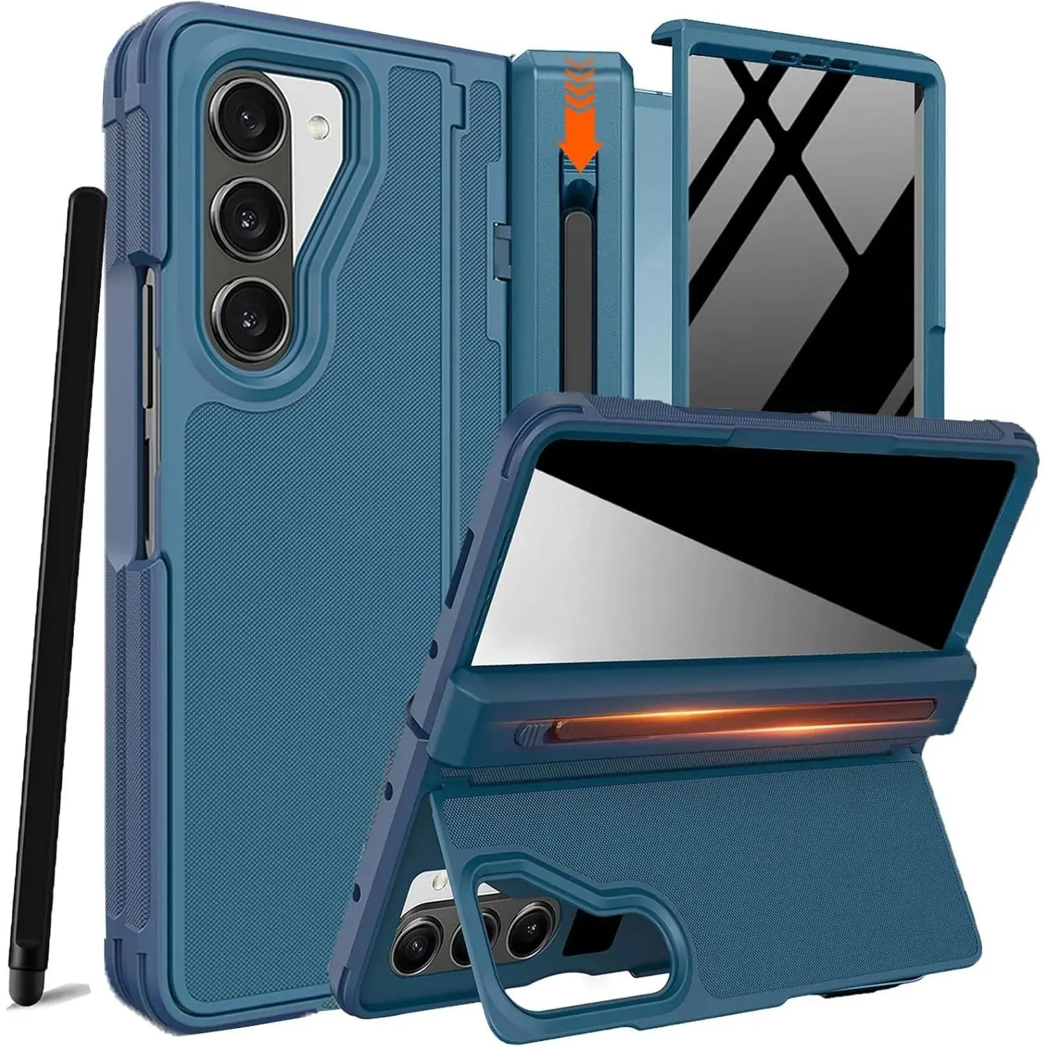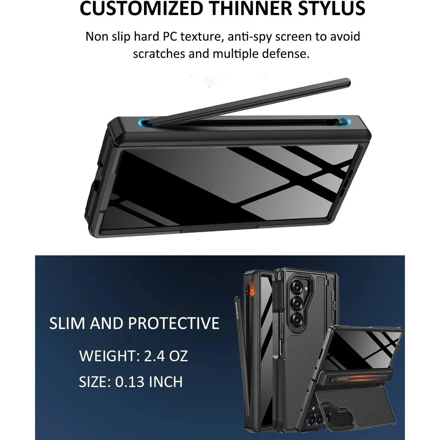 ·〖Compatible for Z Fold 5〗- Kickstand and S Pen Holder Case Compatible for Samsung Galaxy Z Fold 5 (2023) ONLY. Ideal 5 in 1 structure: Stylus Pen + S Pen Holder + Hinge Protector + Hidden Kickstand + Privacy Screen Protector, non slip texture touch and shock proof case for galaxy fold 5 phone. ( Reminder : The pen is not an official S-Pen! This is an ordinary capacitive stylus,the tip is rubber,The stylus pen can not be charged and not support bluetooth, case not compatible for Z Fold 3/4/6/7).