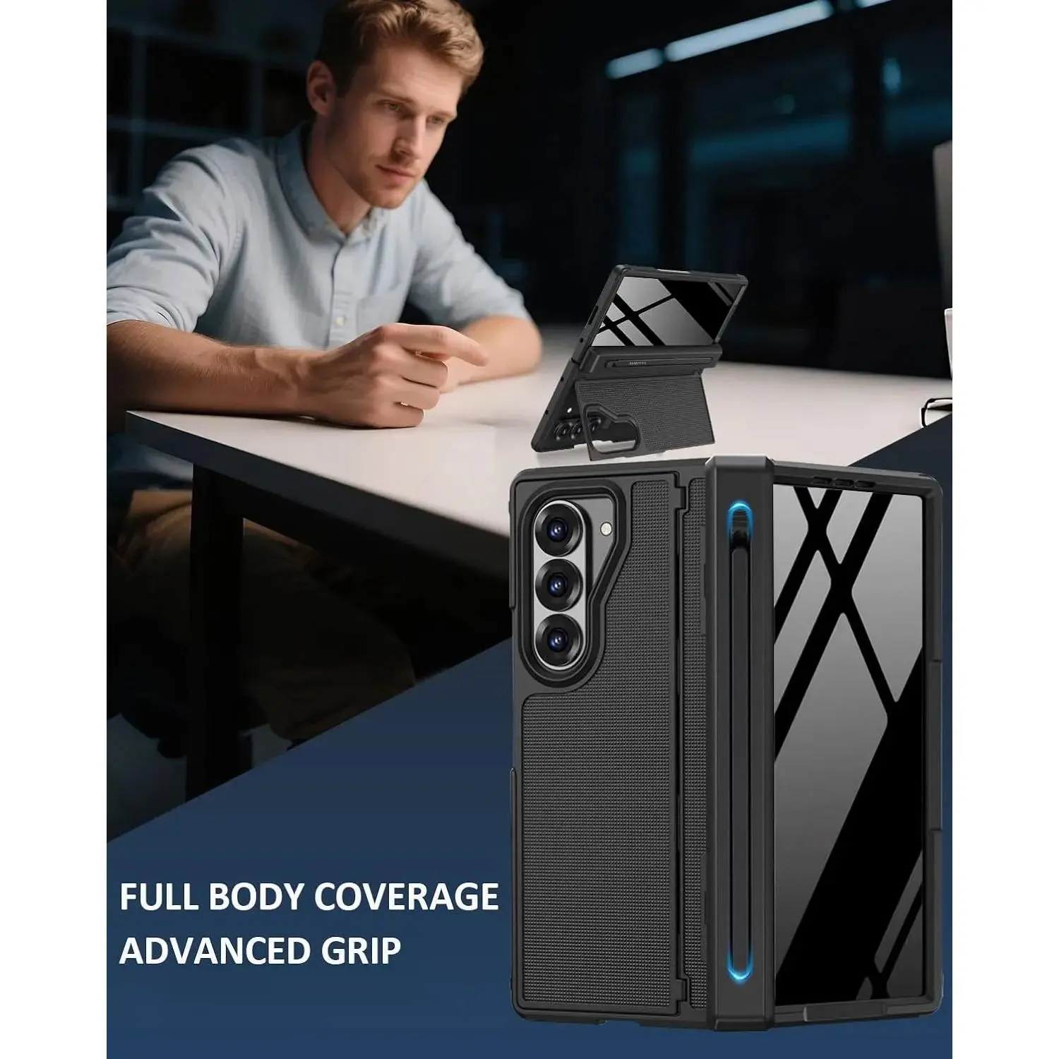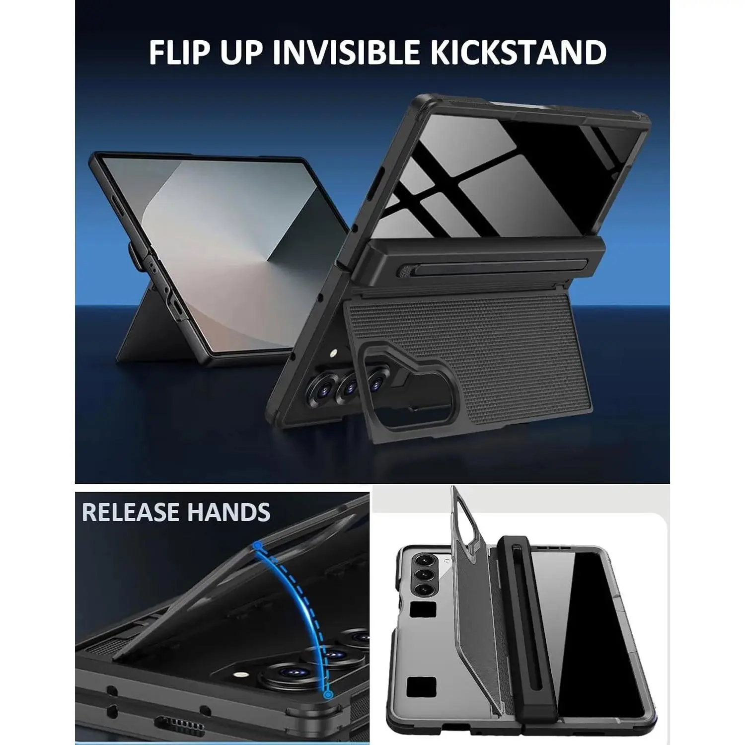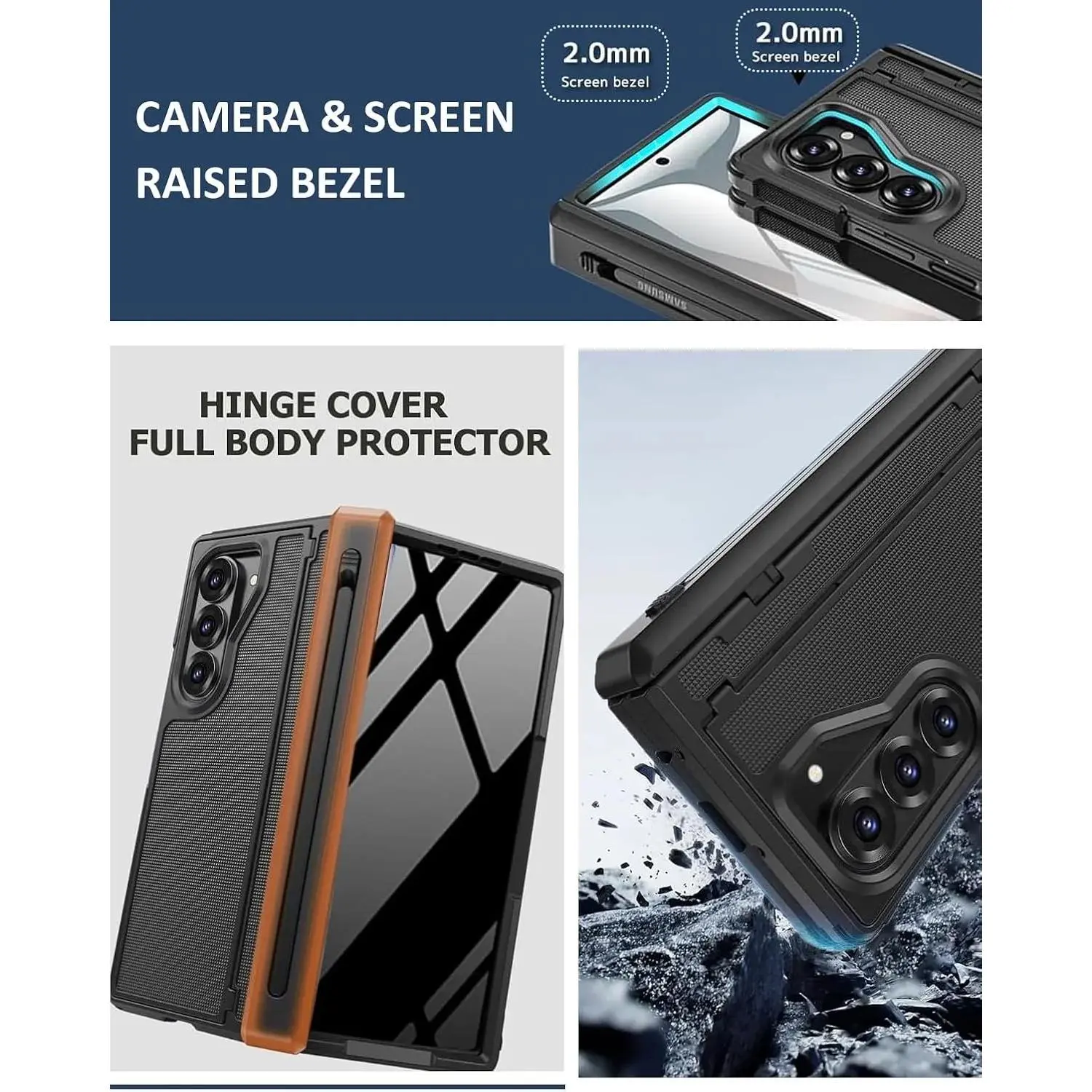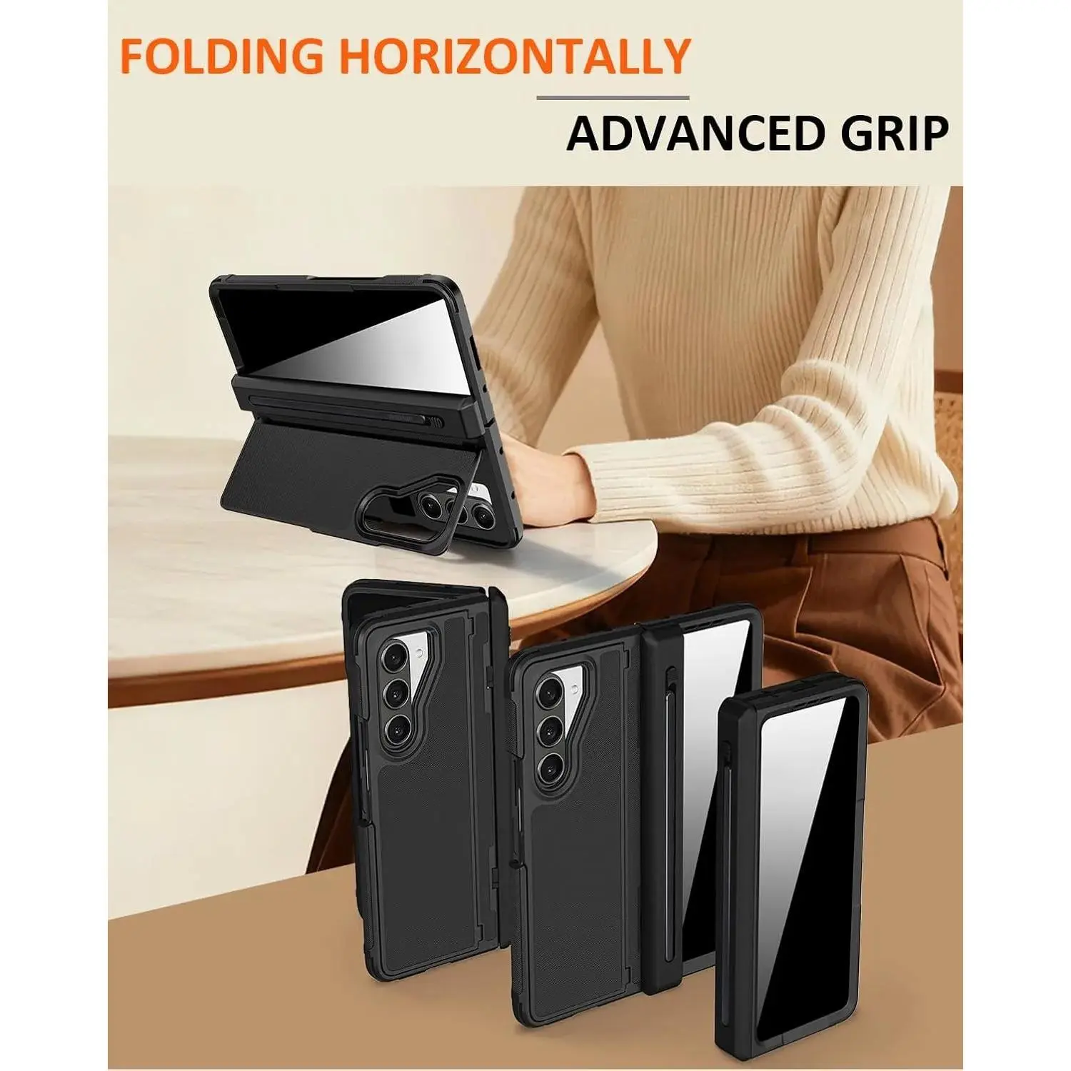 ·〖Compatible for Z Fold 5〗- Kickstand and S Pen Holder Case Compatible for Samsung Galaxy Z Fold 5 (2023) ONLY. Ideal 5 in 1 structure: Stylus Pen + S Pen Holder + Hinge Protector + Hidden Kickstand + Privacy Screen Protector, non slip texture touch and shock proof case for galaxy fold 5 phone. ( Reminder : The pen is not an official S-Pen! This is an ordinary capacitive stylus,the tip is rubber,The stylus pen can not be charged and not support bluetooth, case not compatible for Z Fold 3/4/6/7).