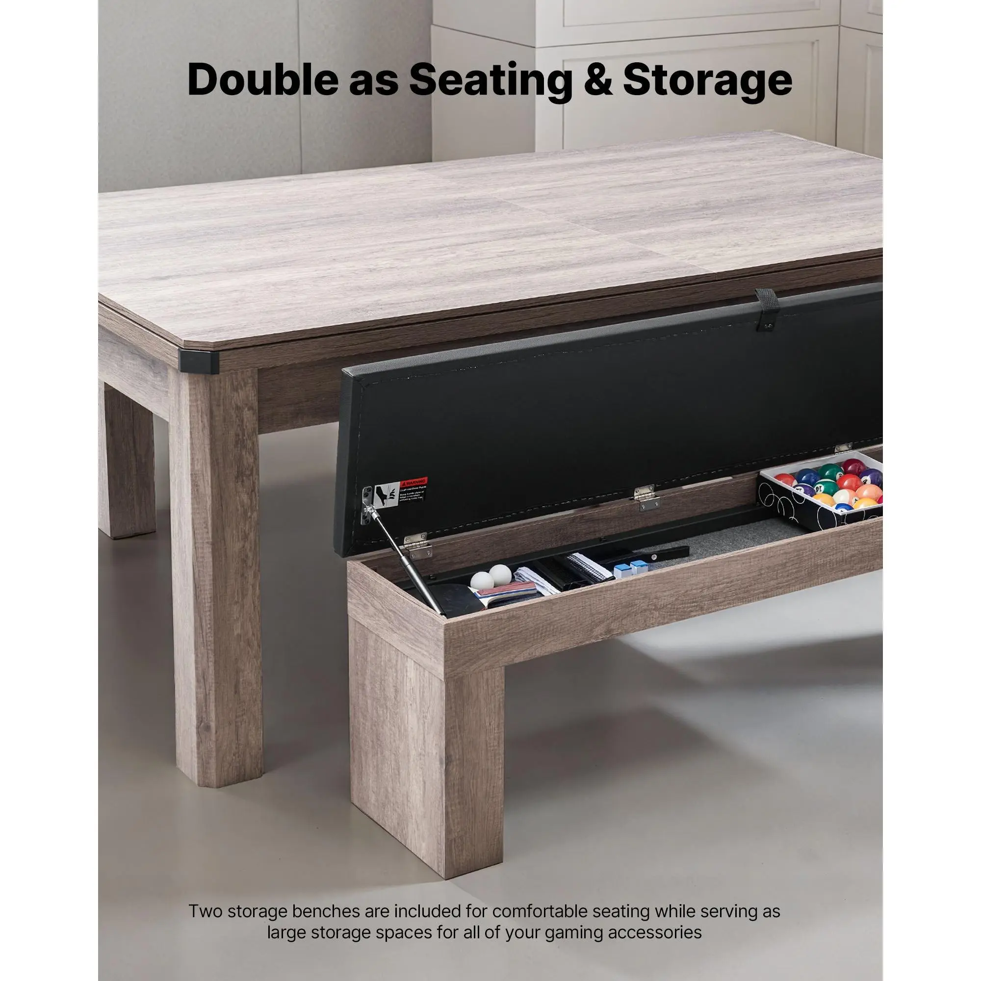Storage benches of this pool table combine seating and hidden storage to maximize small-space efficiency.