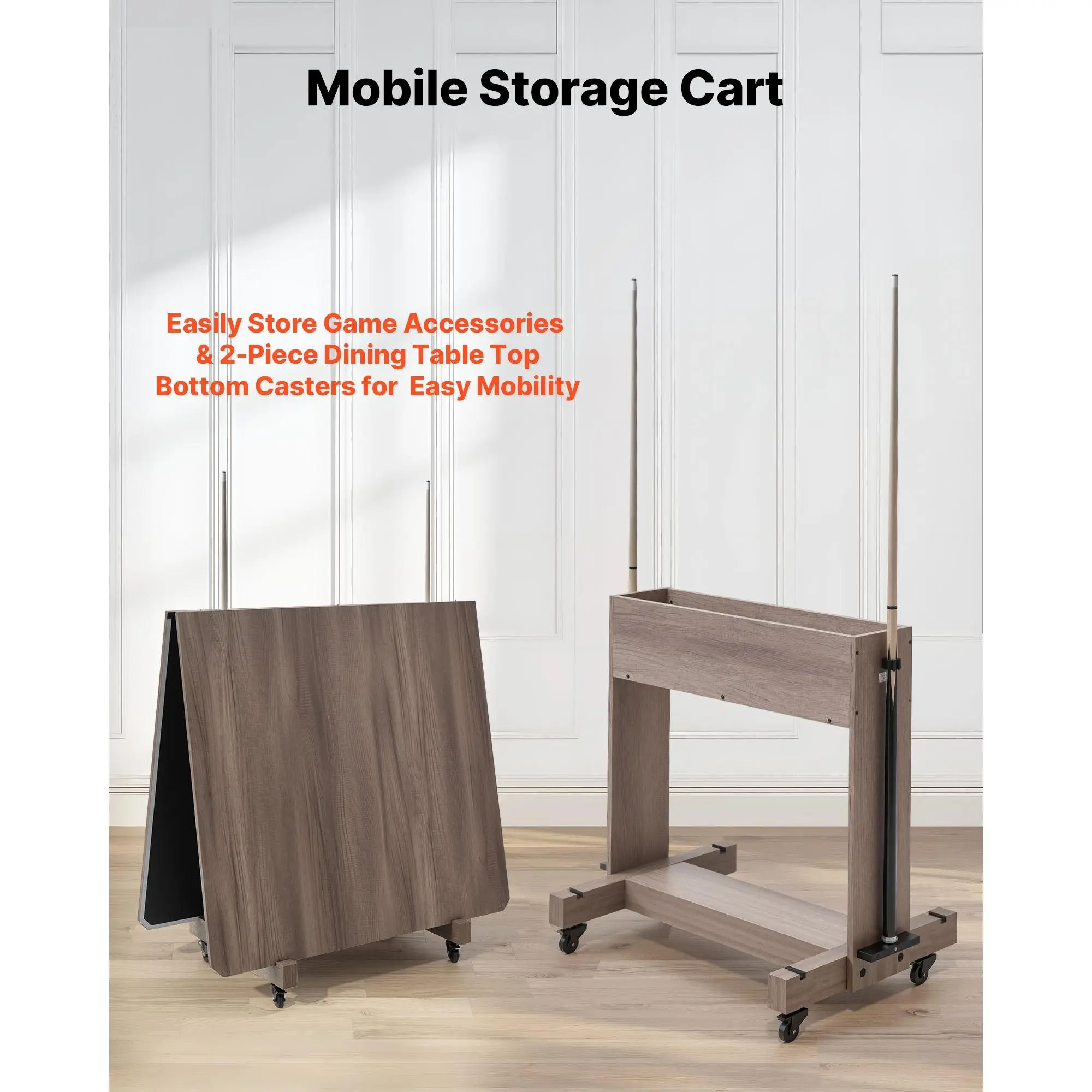The dining top can be stored on the included rolling caddy. It has caster wheels to make moving and organizing accessories easy.