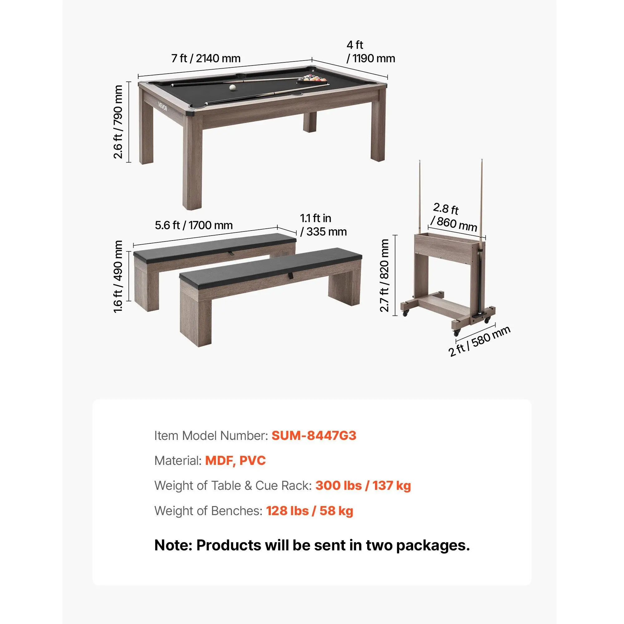 VEVOR 7ft Pool Table Combo Set, 3-in-1 Multi Game Billiards Tables with Dining Top and Ping Pong, 2 Benches for Storage and Accessories, Includes Ball Cue Rack Chalk Brush, for Family Recreation Room