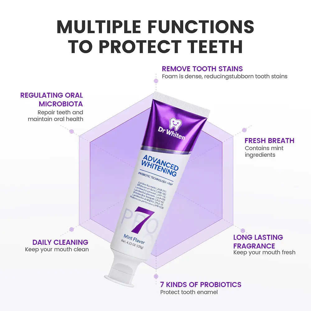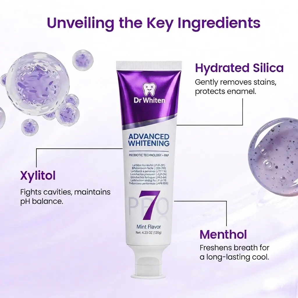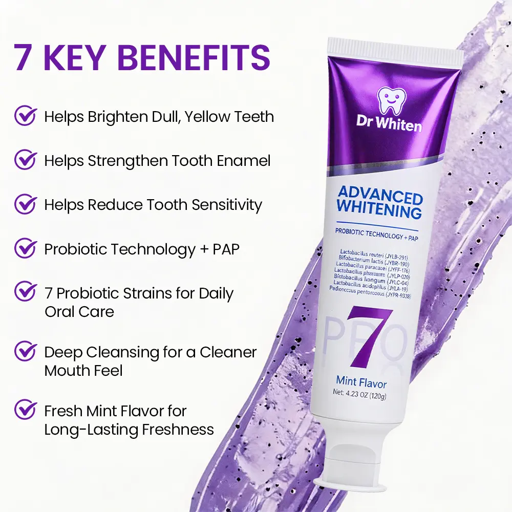 DrWhiten 7-Pro Advanced Whitening Toothpaste, Purple Whitening Formula with 7 Probiotics, Deep Enamel Repair, Fresh Breath, Daily Teeth Whitening Care