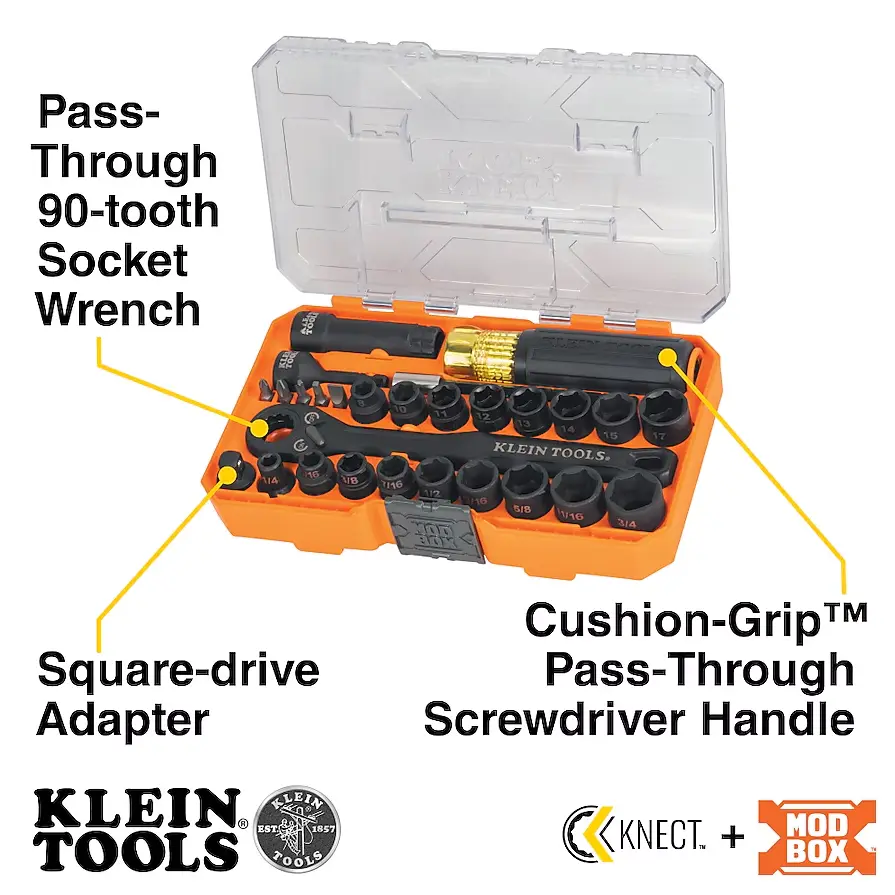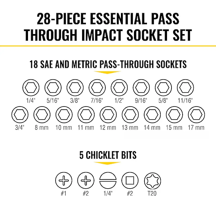 The 28-Piece Essential KNECT Pass Through Impact Socket Set features a 90-tooth pass through ratchet and Cushion-Grip pass-through handle for driving hex nuts on extended threaded rod. The 1/4-Inch square drive adapter allows for use with traditional sockets. Set includes 18 SAE and metric hex bits, 4 adapters, 5 chicklet bits, pass through handle, and socket wrench.