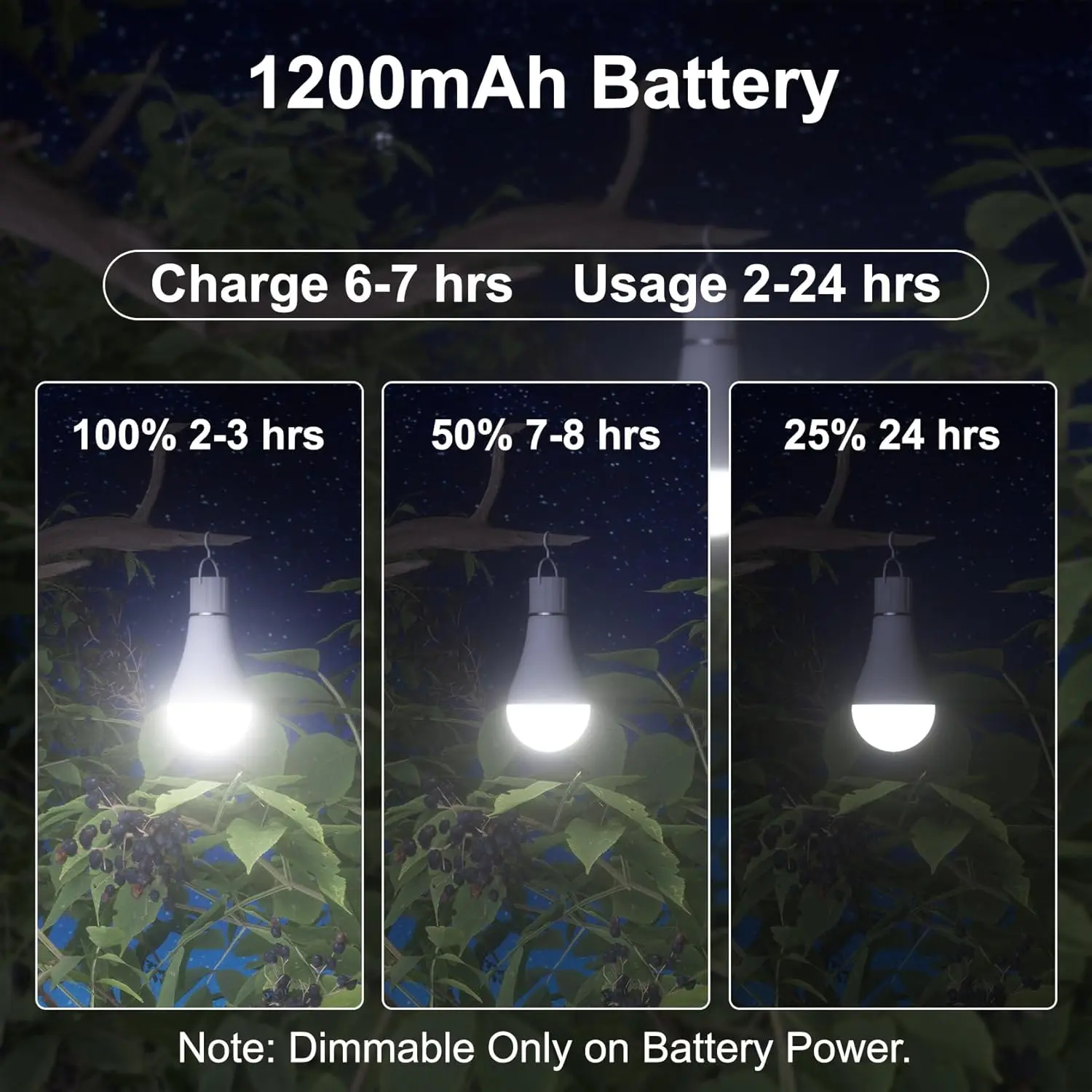 ·[ 3 Levels of Adjustable Brightness ]Battery mode lasts up to 14 hours, rechargeable battery bulb has 3 duration options: 2-3 hours/7-8 hours/14+ hours.100%/50%/10% Brightness is adjustable, use different brightness in different places.10% for bedroom, 50% for bathroom, 100% for living room.There are 2 ways to adjust the brightness: 1.The rechargeable bulbs in the fixtures can only be adjusted by the fixture switch in the event of a power outage;2. Adjust the brightness with the button on the hook.