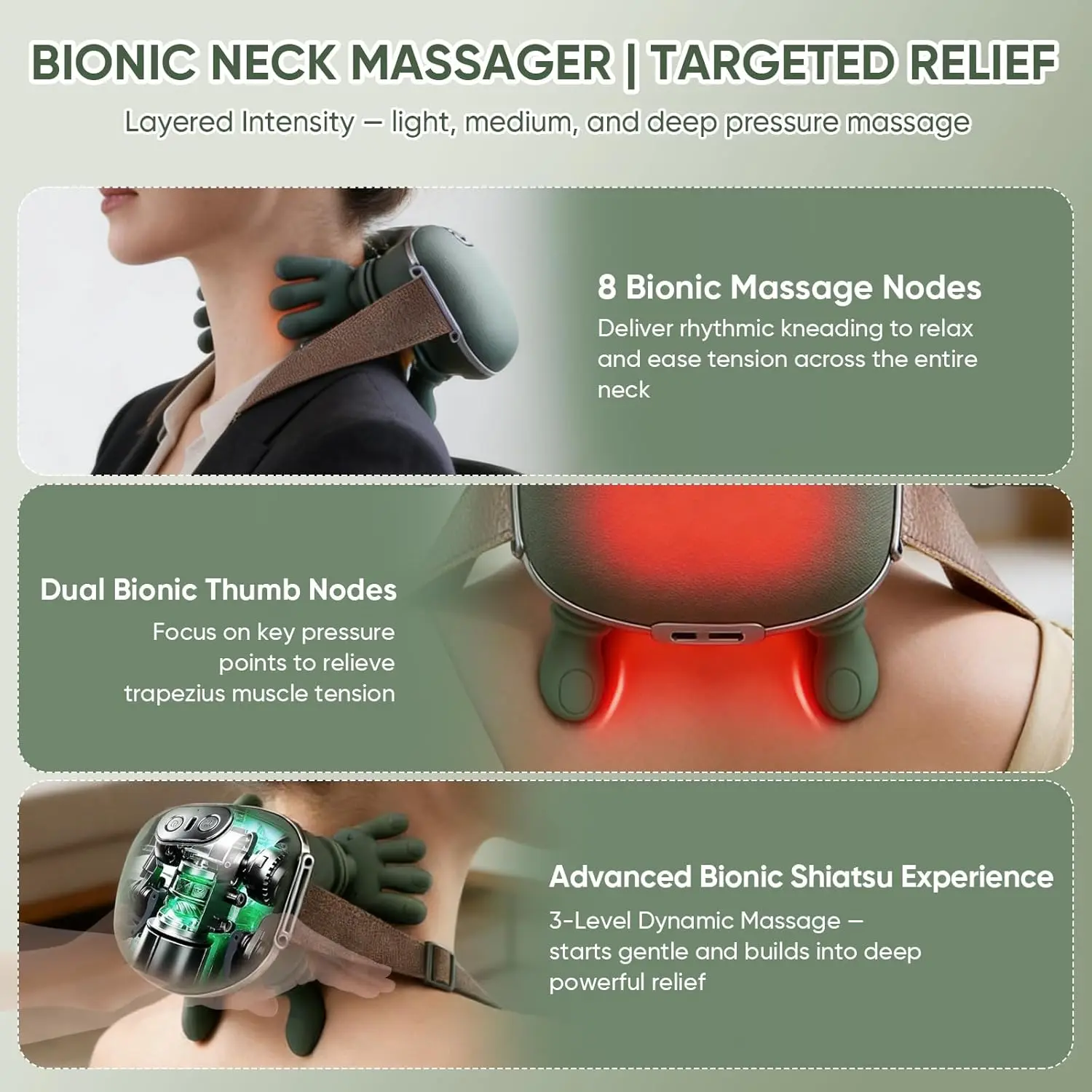 ·【Three Intensity Settings】This neck and back massager with heating features three vibration intensity modes (Low/Medium/High). Whether you prefer gentle strokes or stronger massage pressure, it caters to diverse comfort needs.