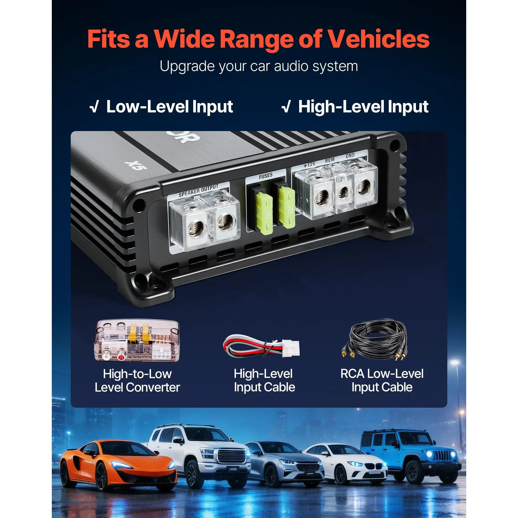 Our amp and subwoofer combo works with various vehicles including sedans, SUVs, and trucks. Wide voltage input and an included high-to-low adapter support both RCA-equipped head units and basic factory stereos.
