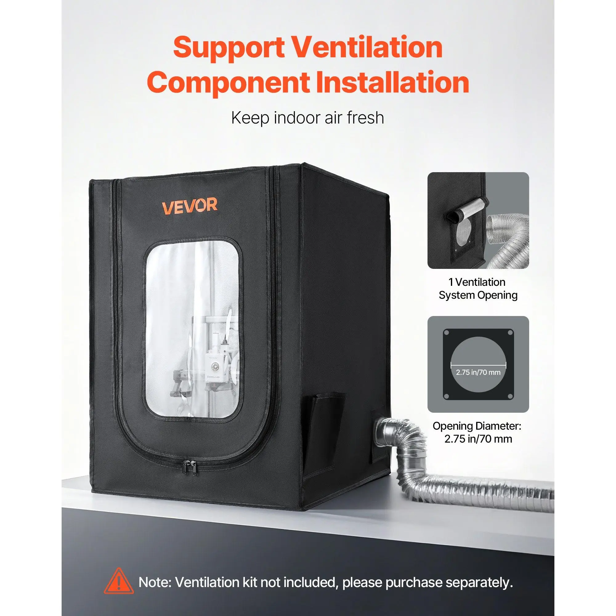 Our printer enclosure features an LED light for nighttime printing and a transparent window for real-time monitoring. The zipper allows easy opening and closing, and reserved holes for power and data cables keep wiring neat and organized.