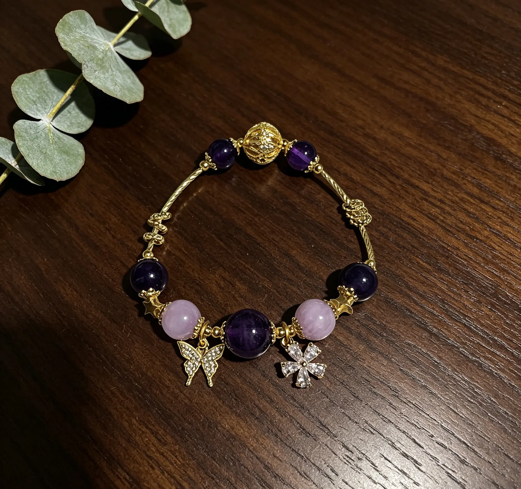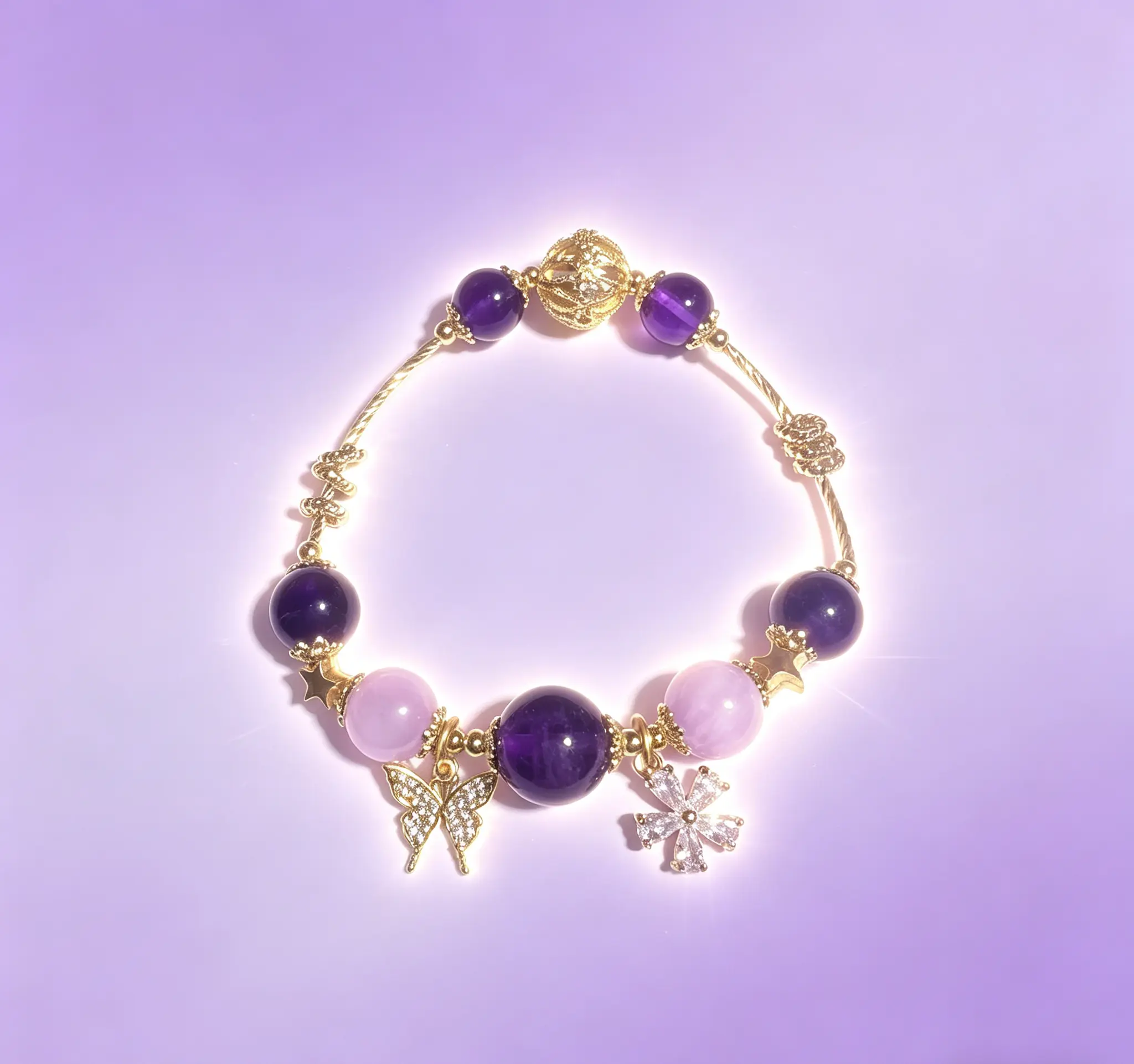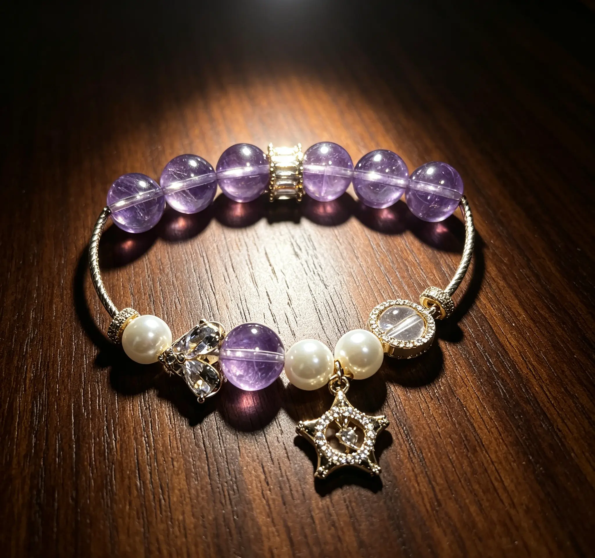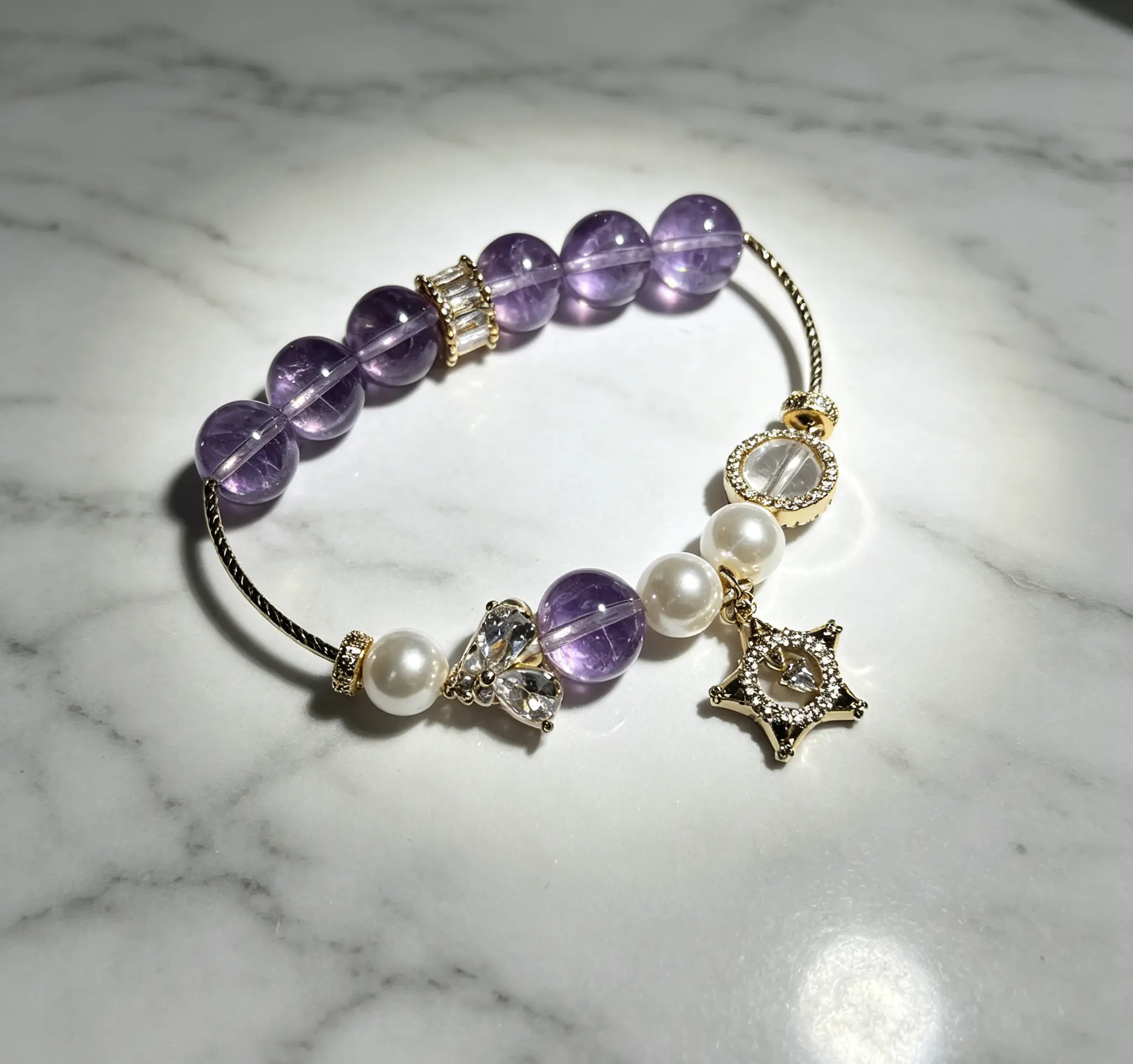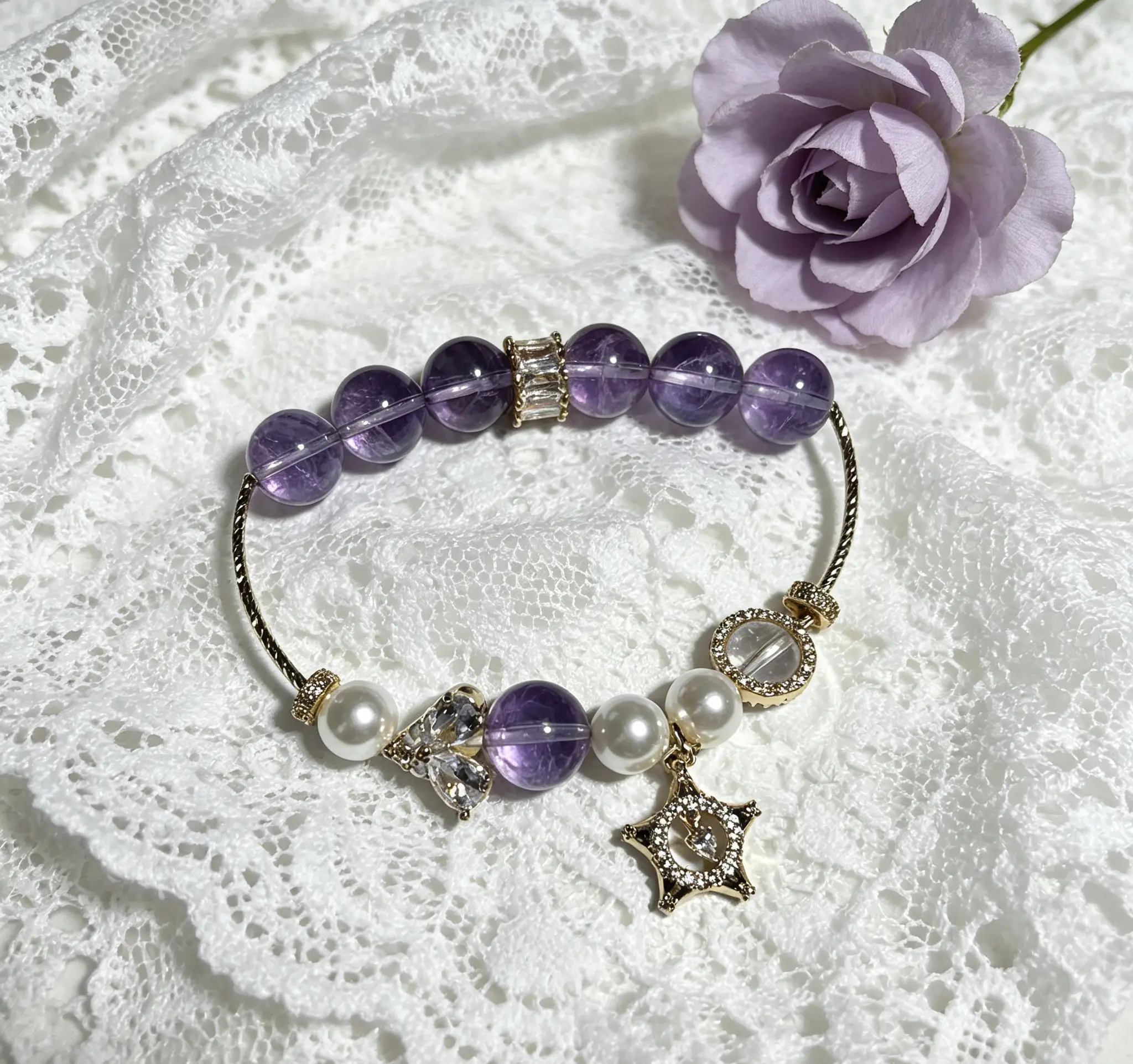 This natural amethyst and pearl bracelet is handcrafted with carefully selected clear and translucent natural amethyst, paired with lustrous pearls and exquisite luxury metal accessories, perfectly integrating the mysterious and elegant temperament with the healing energy of crystals. Since every natural crystal rough stone is one-of-a-kind, there will be slight variations in the size and weight of each bracelet. Wear it for daily commutes to help calm your restless mind and soothe tense emotions. Put it on during yoga and meditation to help you enter a relaxed state faster, purify the chaotic energy around you, and bring you peaceful and stable inner strength in daily life.