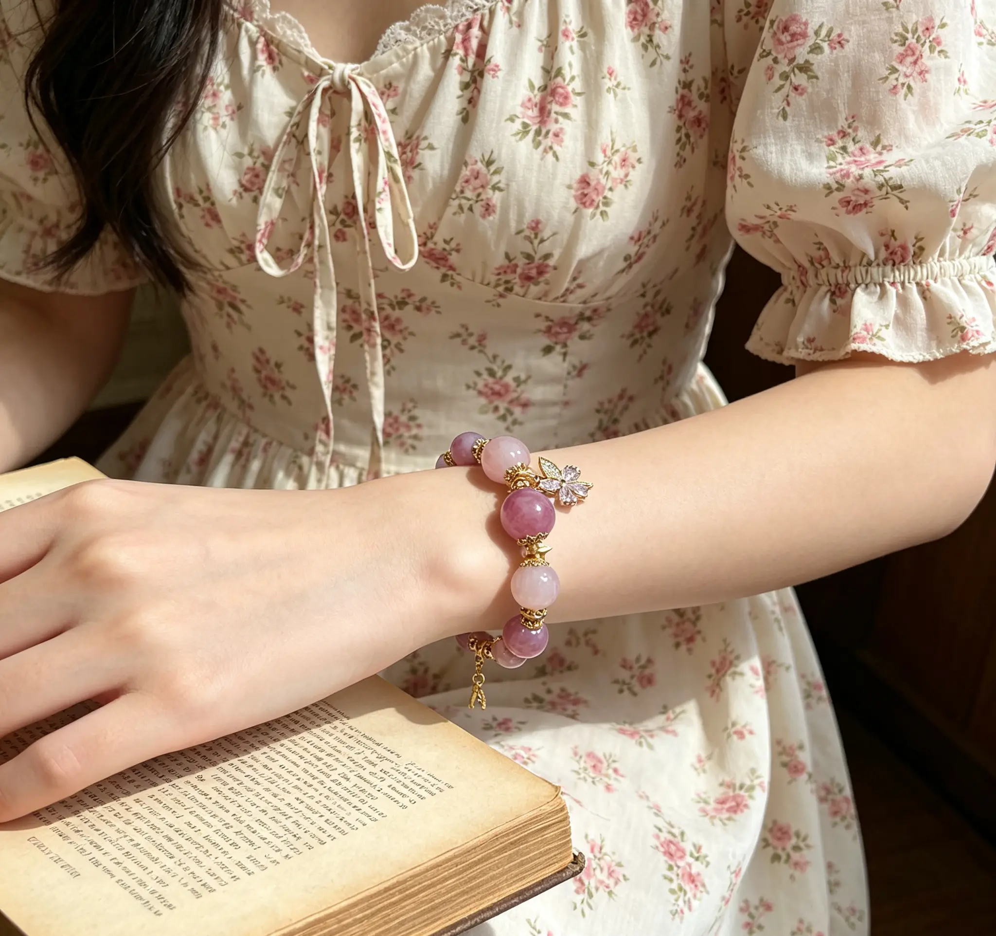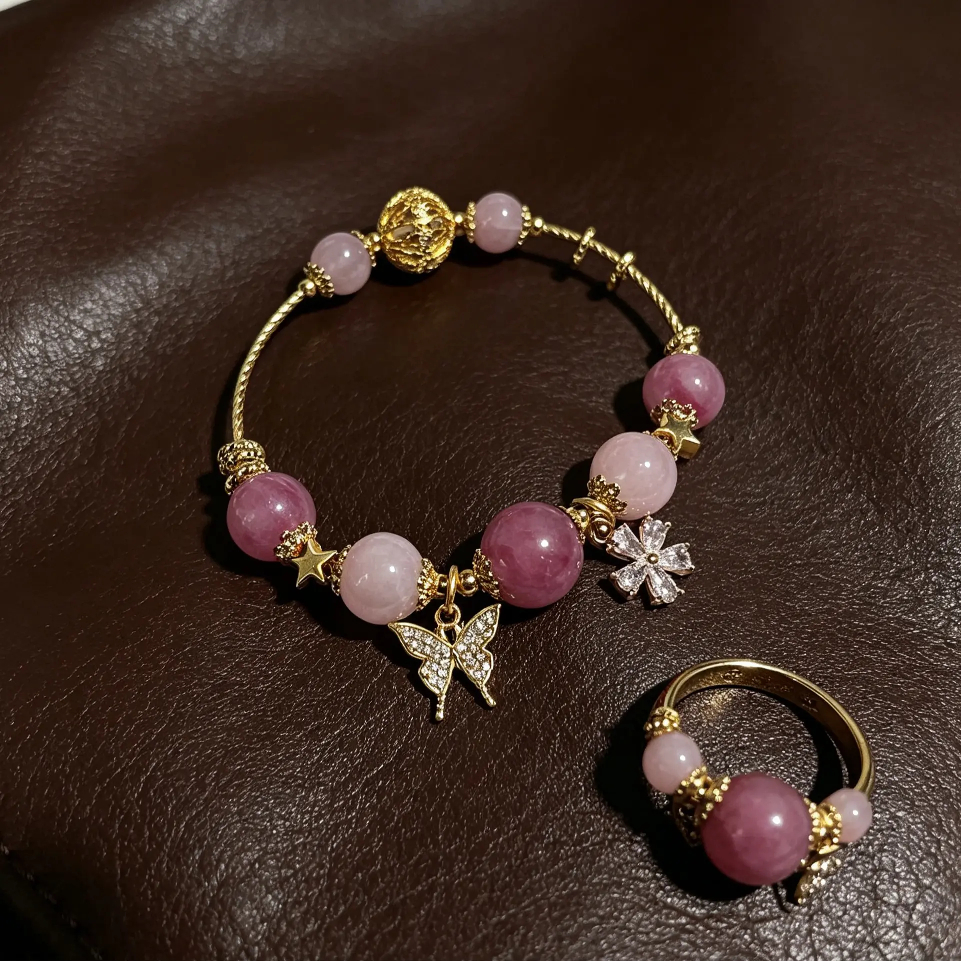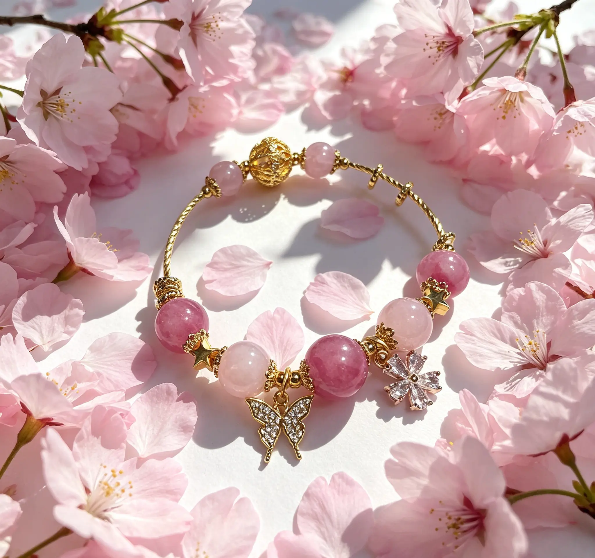 This natural pink crystal gold bracelet is hand-strung with carefully selected gentle and tender natural pink crystals and exquisite gold accessories, perfectly integrating the elegant and soft temperament with the crystal's healing energy. Since each natural crystal rough stone is one-of-a-kind, there will be slight variations in the size and weight of each bracelet. Wear it during daily commutes to help you soothe your mood and enhance your presence. Put it on when dating or gathering to add a gentle and romantic vibe to you, bringing you healing and calmness in daily life.