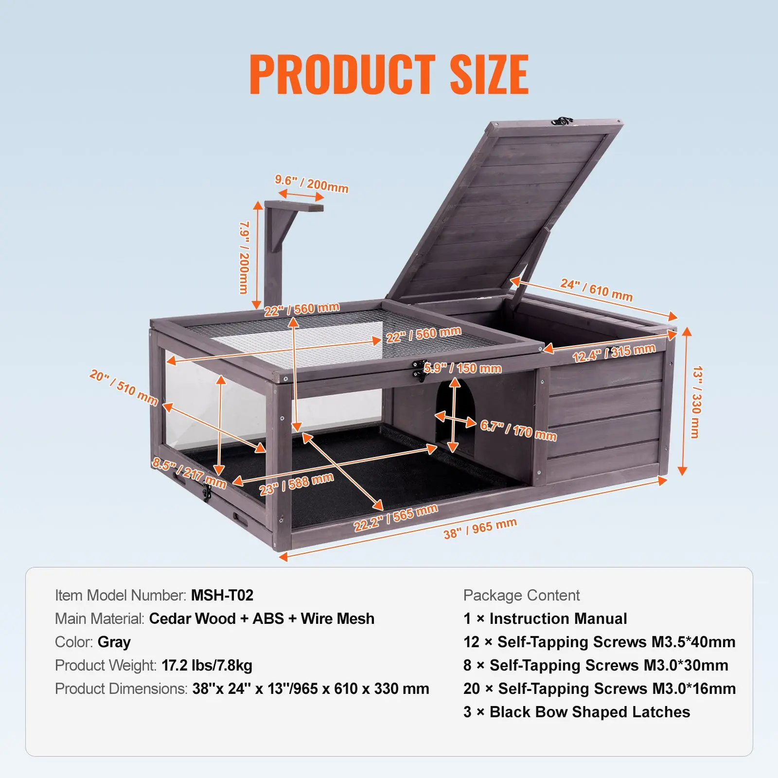 Our tortoise house is made of premium cedar wood, known for its dense texture, durability, and resistance to deformation. The exterior is coated with waterproof paint. The high-quality metal mesh top is tightly woven, providing a safe and comfortable living and entertainment space for your pet.