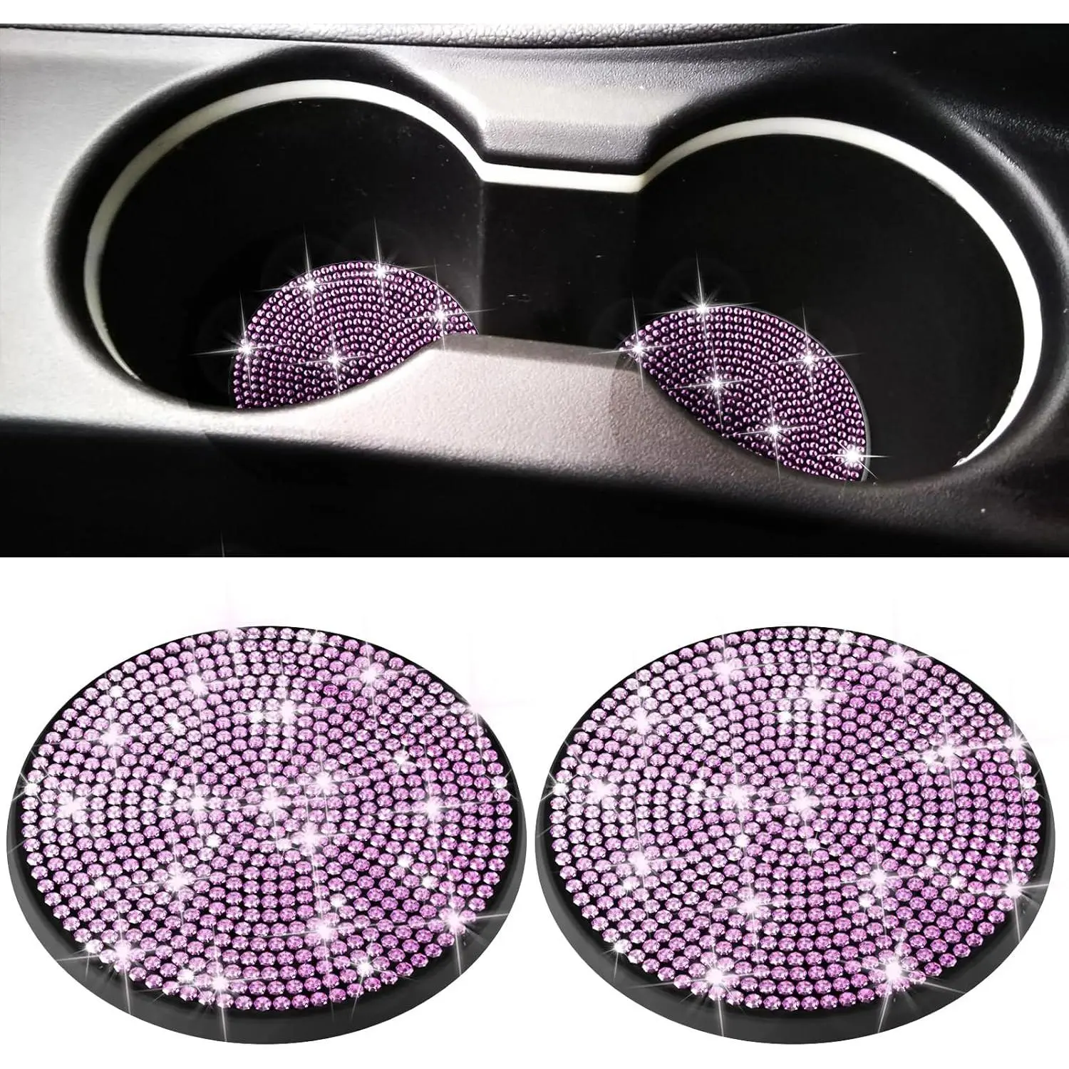 2 PCS Bling Cup Holder Coaster, 2.75 inch Diamond Universal Non-Slip Silicone Cup Holder Coasters, Sparkly Bling Car Accessories for Women (Purple)
