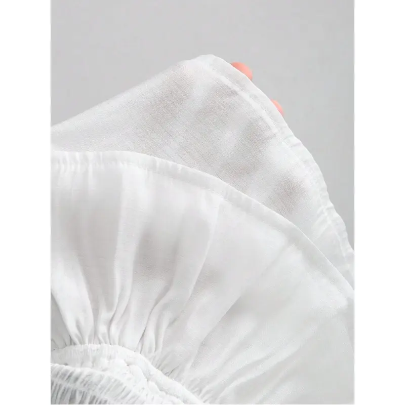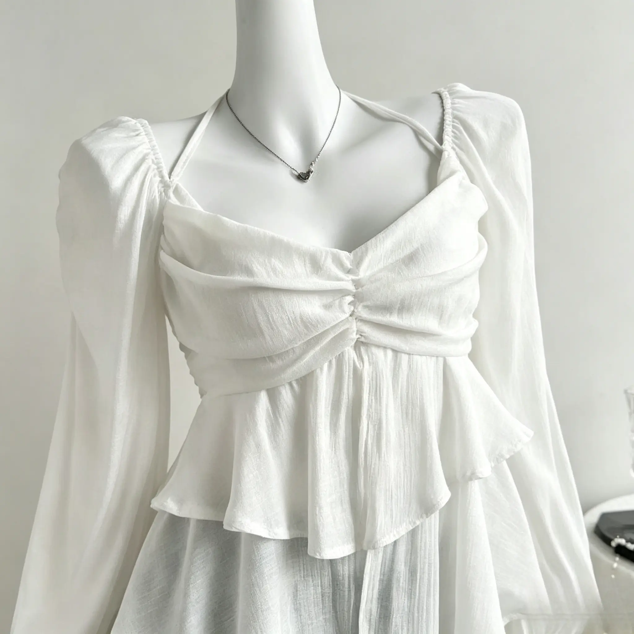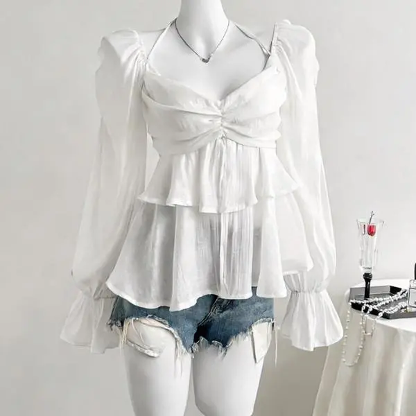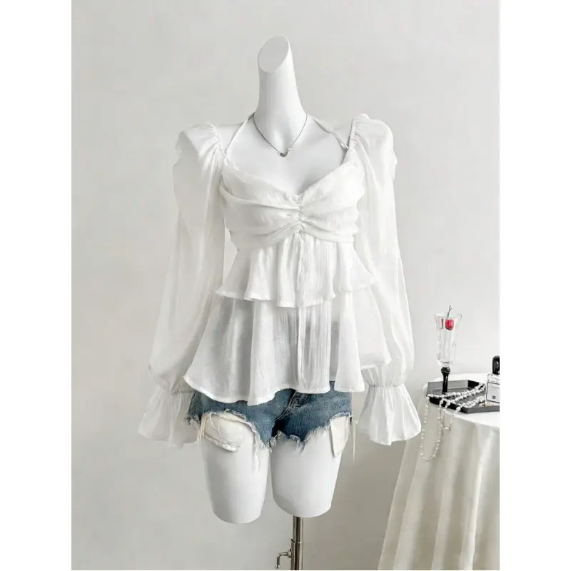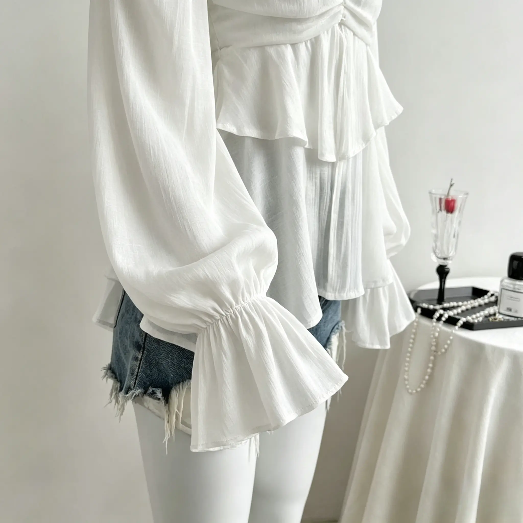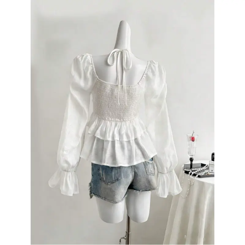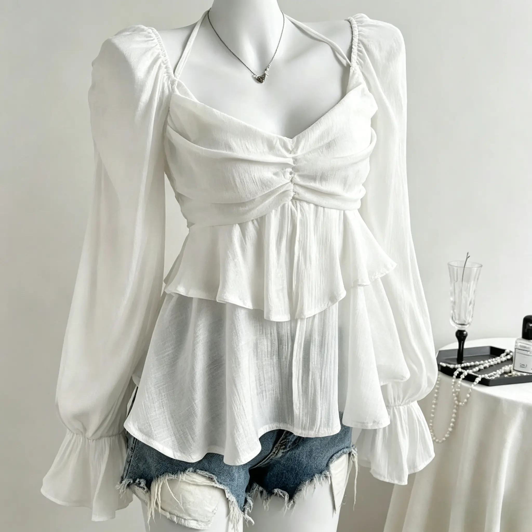 Elegant French-style sheer fabric blouse with ribbon ties and ruffled long sleeves for women, featuring ruffles, asymmetrical design, knotted detail, solid color, bell sleeves, suitable for spring, summer, and autumn