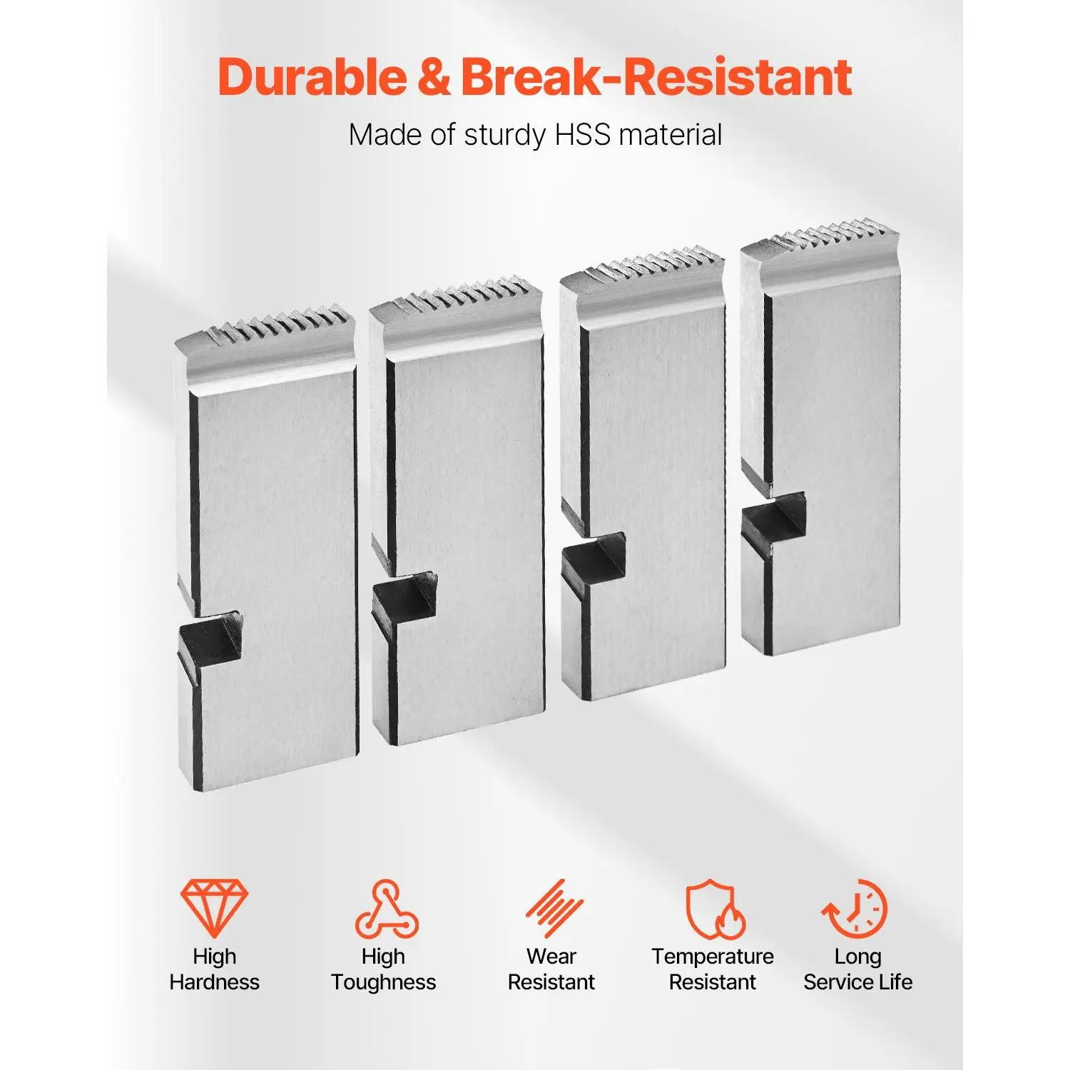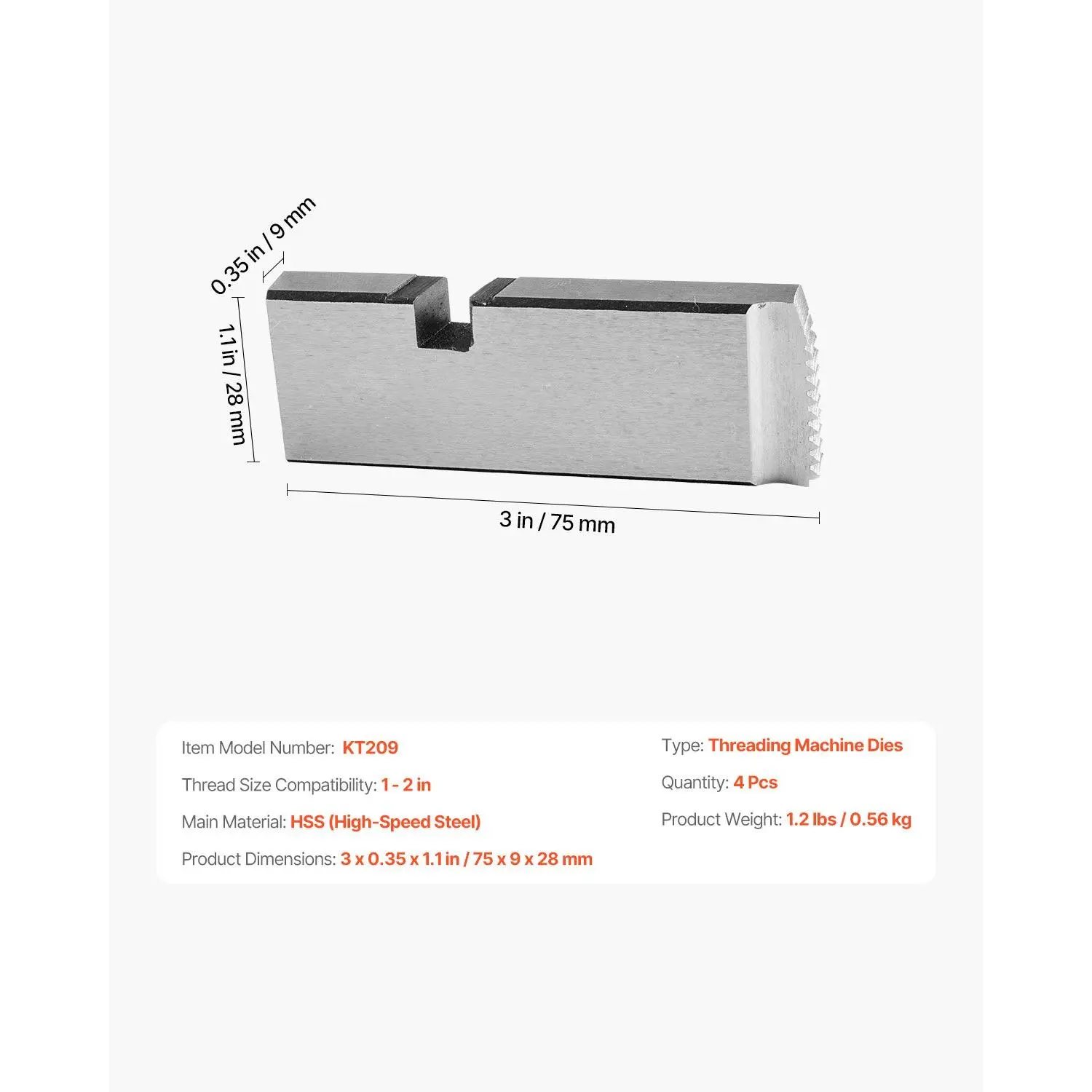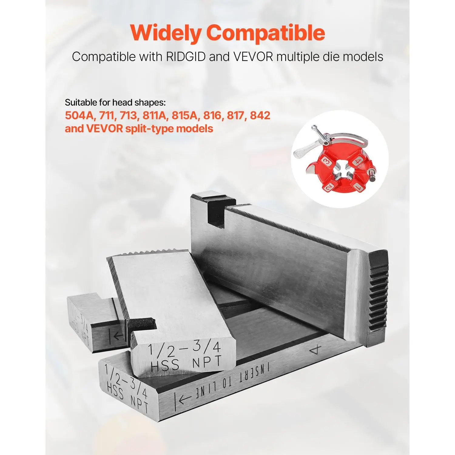 These high-quality threading dies for NPT 1/2 to 3/4-inch pipes are made from durable HSS steel. Compatible with RIDGID universal die heads and VEVOR split-type machines, these pipe threading dies ensure sharp, accurate threads. Simply install them by following the numbered sequence.
