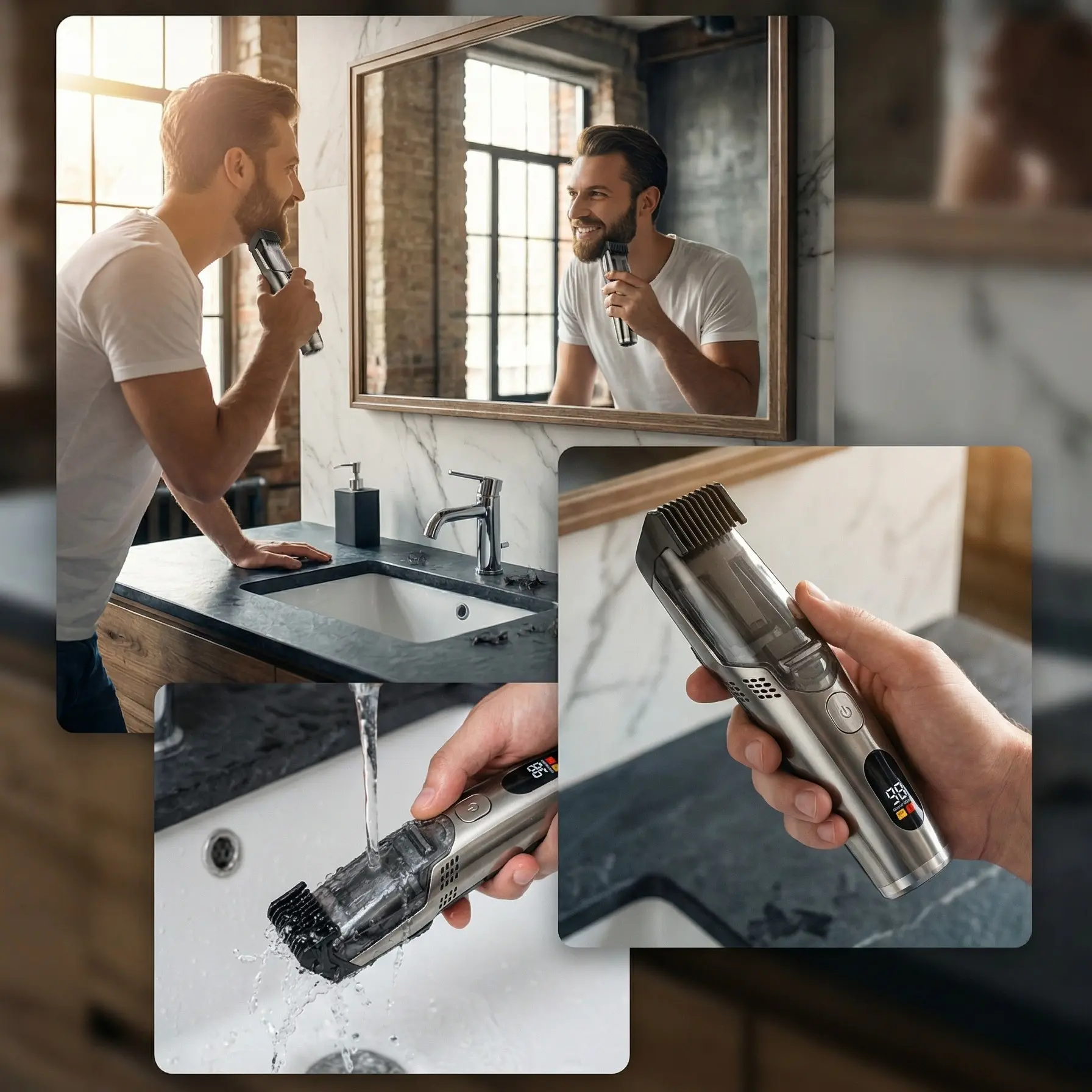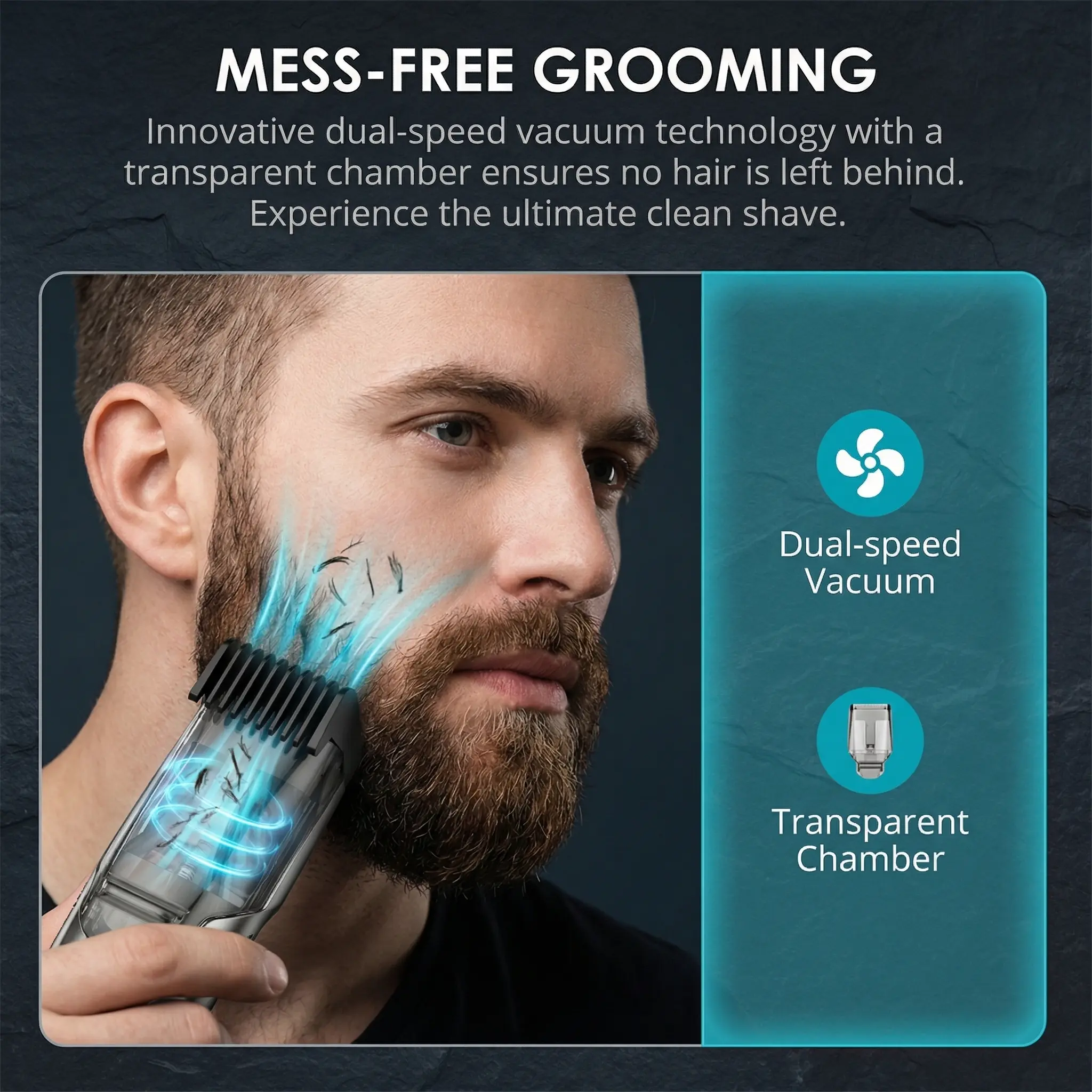 · Vacuuming Design, Effortless Cleanup: Experience a mess-free grooming routine with our Vacuum Beard trimmer for men. Our built-in super suction vacuum trimmer effortlessly captures trimmed hair in an internal compartment for easy disposal and cleaning. Say goodbye to scattered beard on your sink and floors
