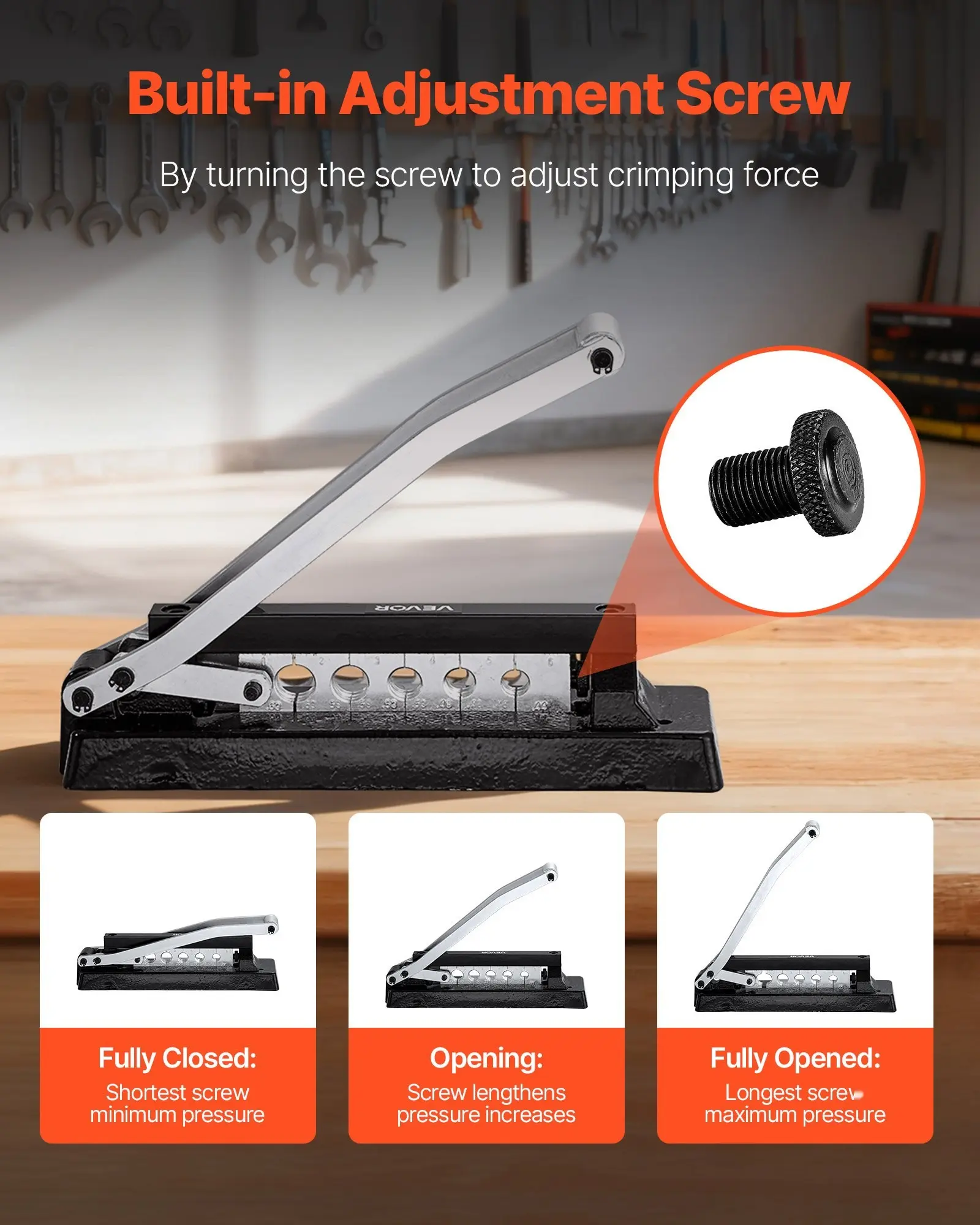 The heavy-duty standard hose crimping tool comes with 5 crimping holes (0.44", 0.48", 0.53", 0.58", 0.63") for diifferent hose sizes. Combined with its sturdy structure and built-in adjustable screw to ensure secure and reliable crimping for air hose, torch hose and garden hose repair.