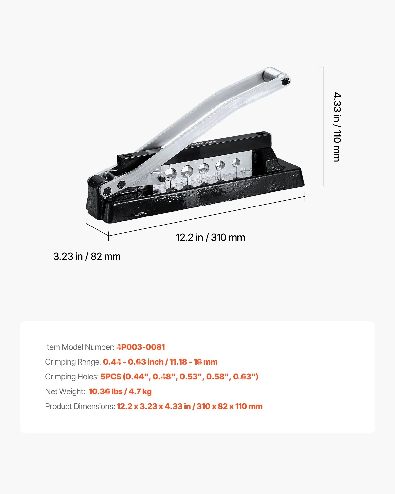 ·Durable and Sturdy: Constructed with heat-treated steel dies, a heavy-duty ductile cast iron base, reinforced hinge points, and thickened frame, this heavy-duty hose ferrule crimper delivers long-term durability and performance
