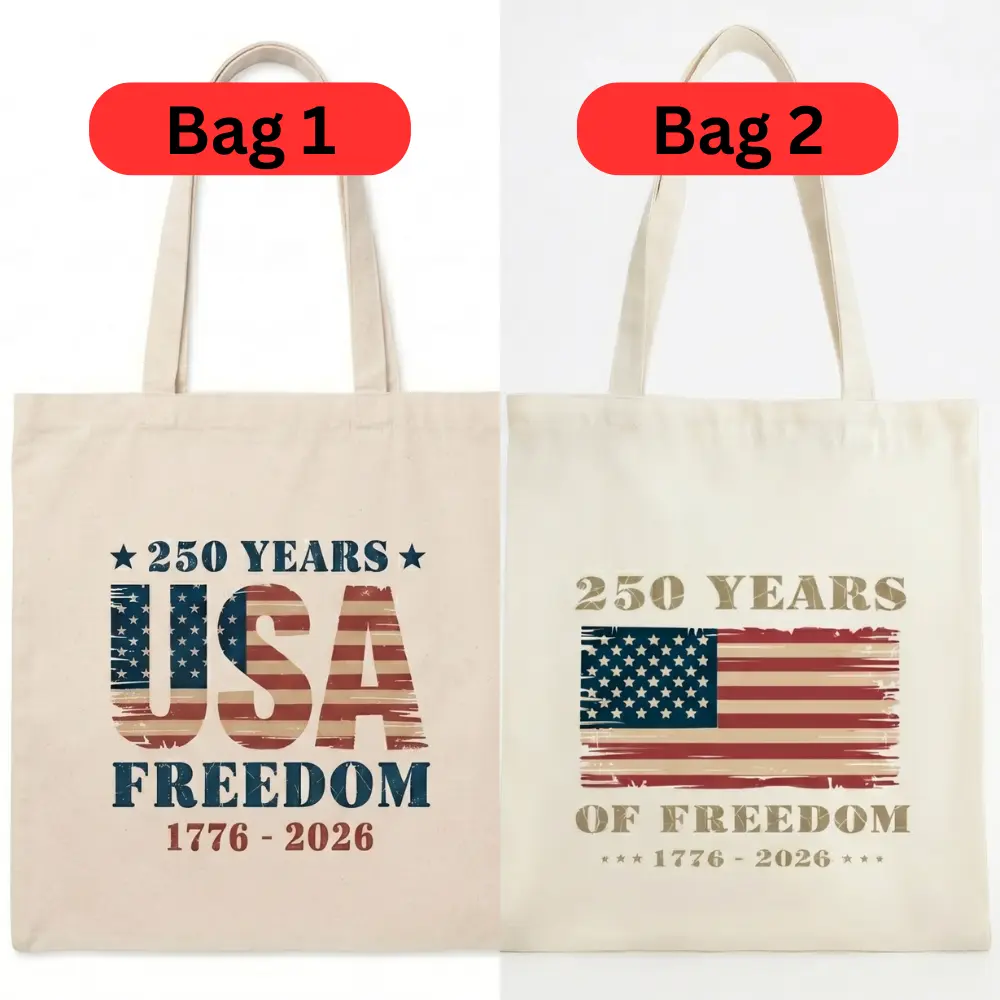·Bag 2: Minimalist USA flag design with “250 Years of Freedom” – clean, classic, timeless look