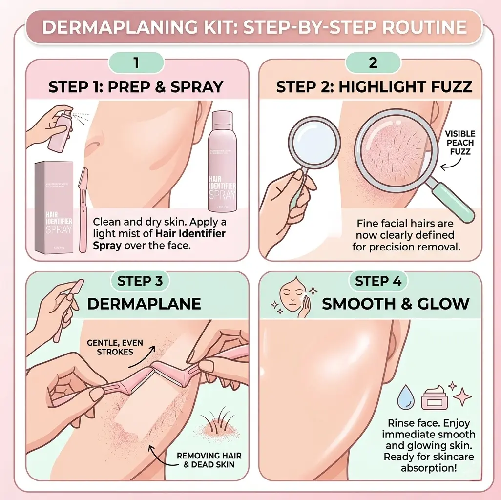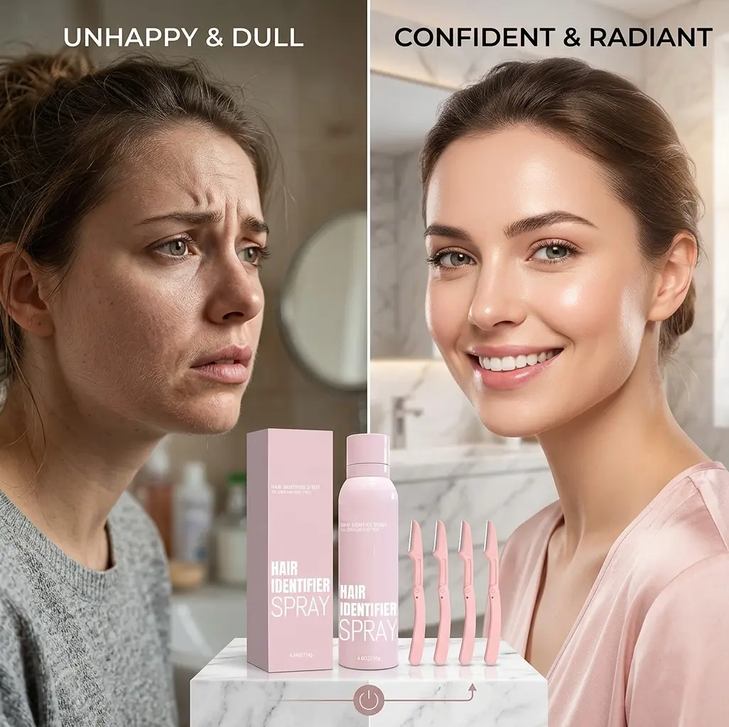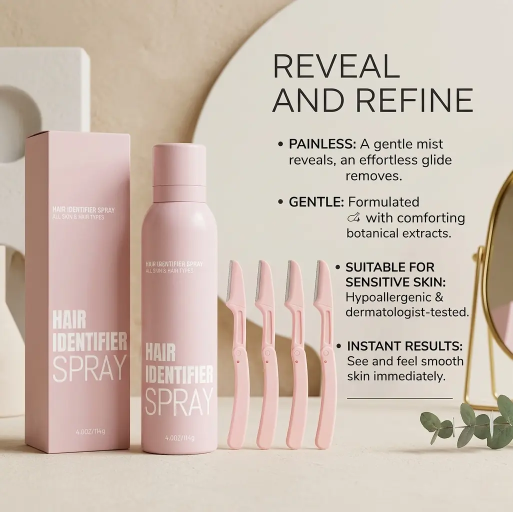 Are you missing hidden facial fuzz that makes your foundation look cakey? Our Hair Identifier Spray is the ultimate beauty hack. It coats fine, invisible "peach fuzz" in a temporary white highlight, allowing you to shave with 100% precision for a professional-grade dermaplaning result at home.