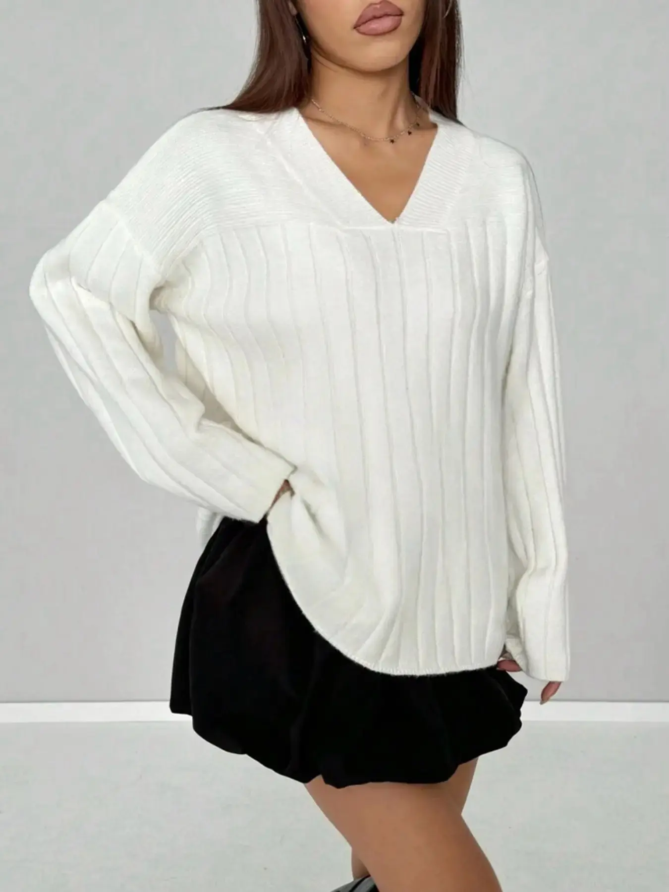 Women's Casual Loose-Fitting V-Neck Sweater Knitwear, Spring & Fall Fashion, Plain Color, Long Sleeve, Versatile and Comfortable