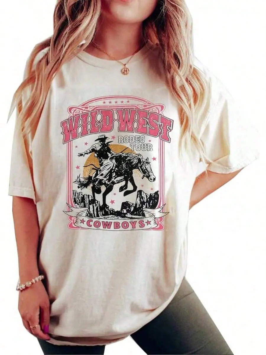 Tops2026Women's Western Cowboy Shirts Vintage Rodeo Graphic Oversized Tops Country Music Tees Short Sleeve Cowgirl-Shirt,Summer Family Or Friends