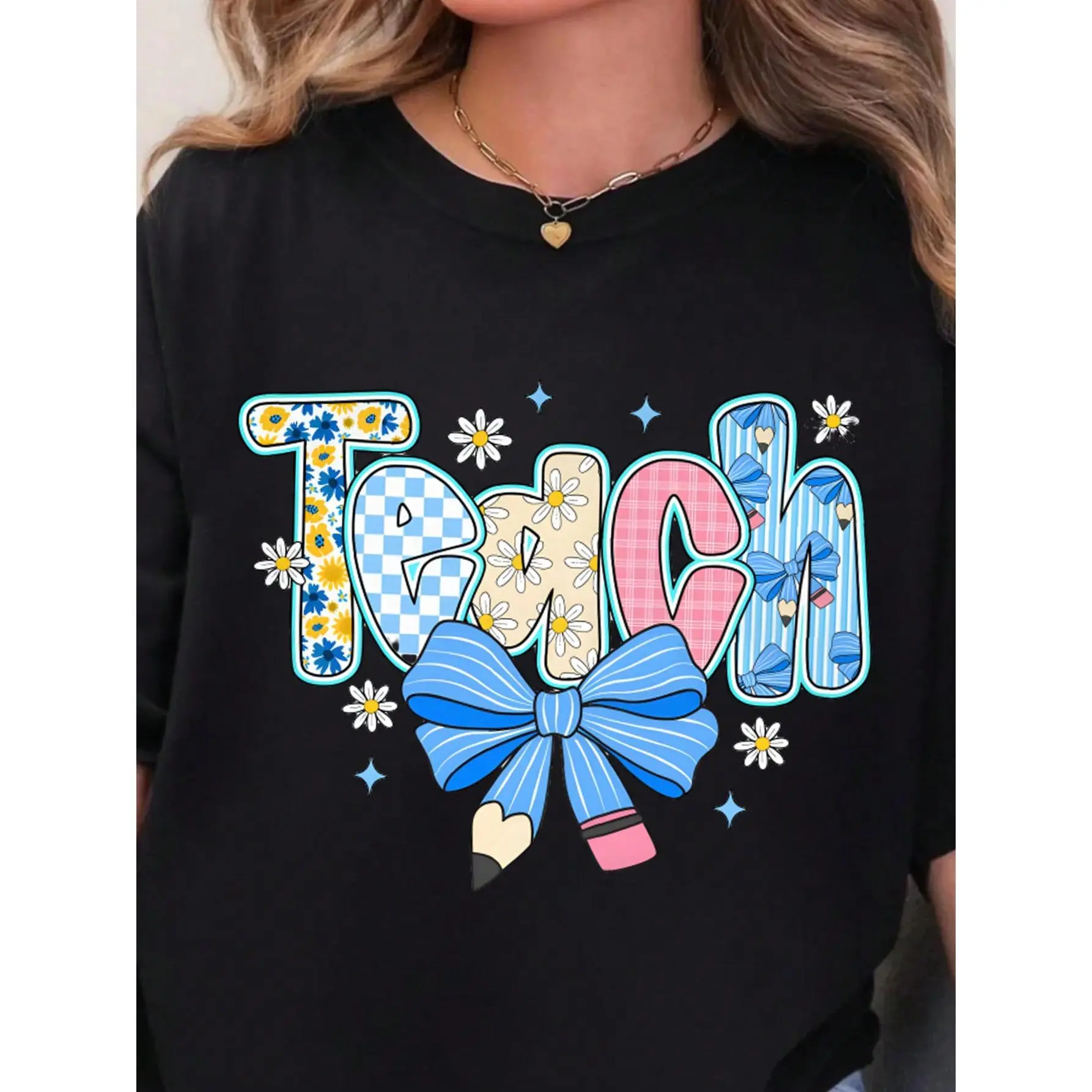 Preppy Teacher Floral Coquette T-Shirt – Blue Floral Tee, Pencil Bow Checkered Top for Women