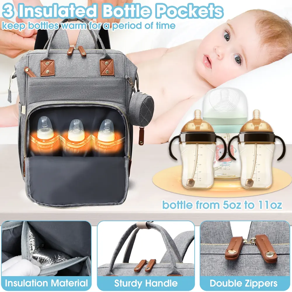 ·16 Pockets for Well-organized: 16 pockets include waterproof pocket, side pocket, tissue pocket, 1 little case, 2 front pockets, double-zip main compartment, 2 privacy pocket, 4 elastic pockets, 3 insulated pockets ( hold milk bottle 5 oz-11 oz ). These pockets are enough to hold almost baby items, make them well-organized and get them quickly.
