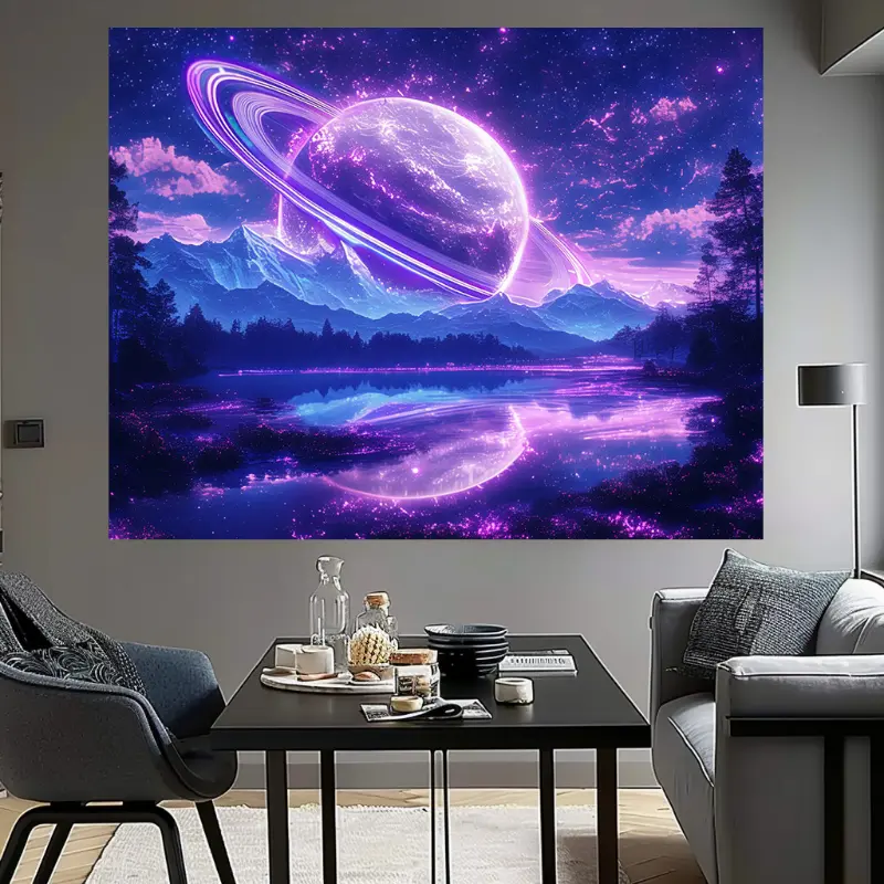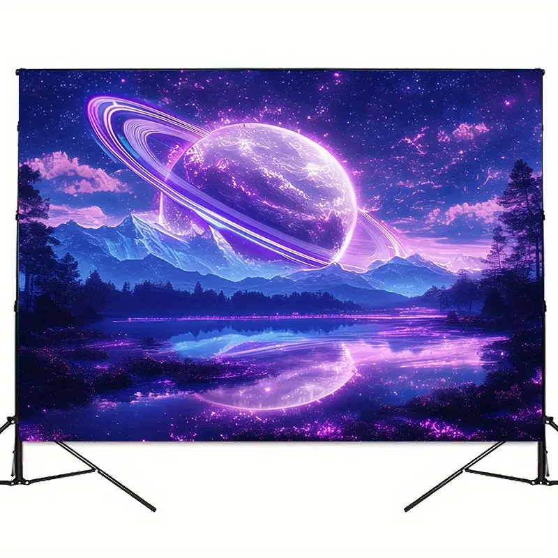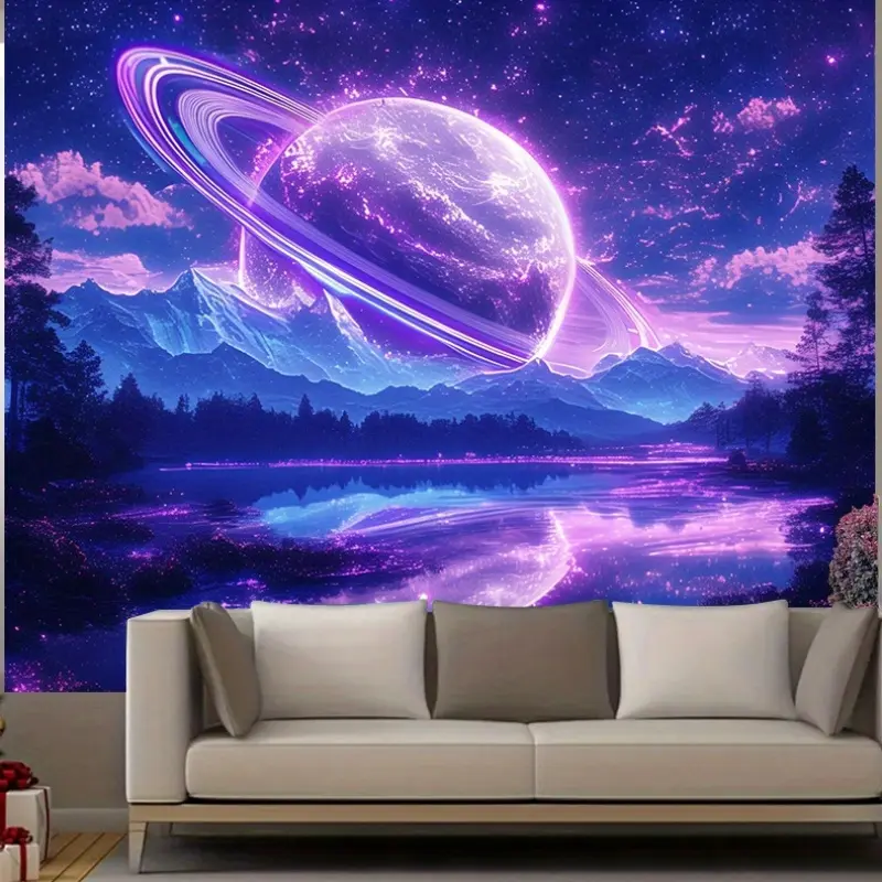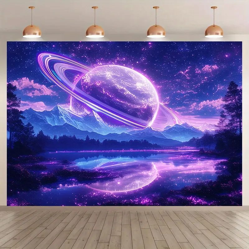1pc Polyester Galaxy Space Tapestry, UV Reactive Blacklight Planet Mountain Lake Scene Backdrop, Neon Aesthetic Decoration for Photography, Photo Booths, Parties, and Home Decor - Use Without Electricity