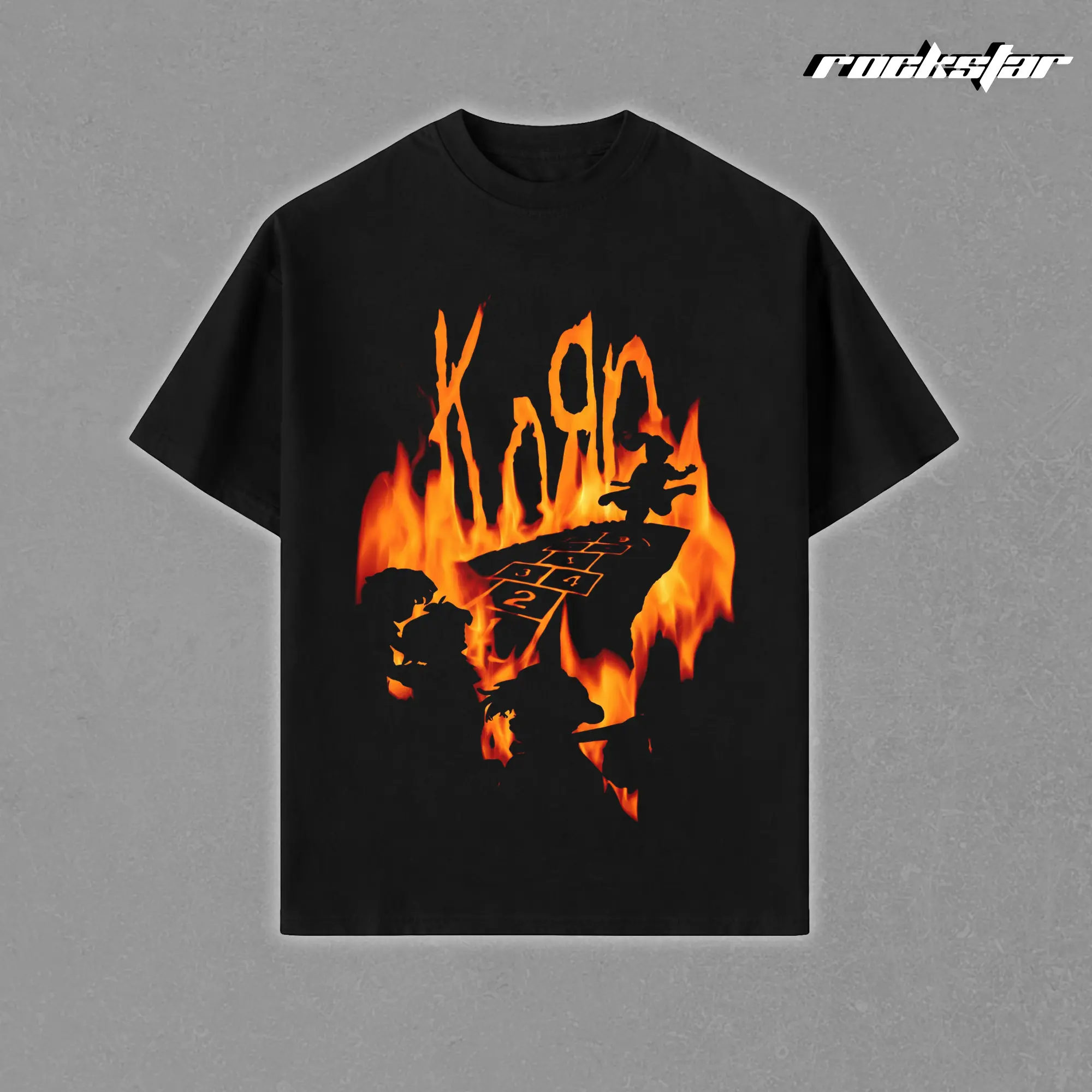 Oversized Vintage Flame Hopscotch Graphic T-Shirt Black - Heavyweight Soft Cotton, Bold Fire Design, High Quality Print, Bootleg Dark Rock Concert Streetwear Tee Unisex