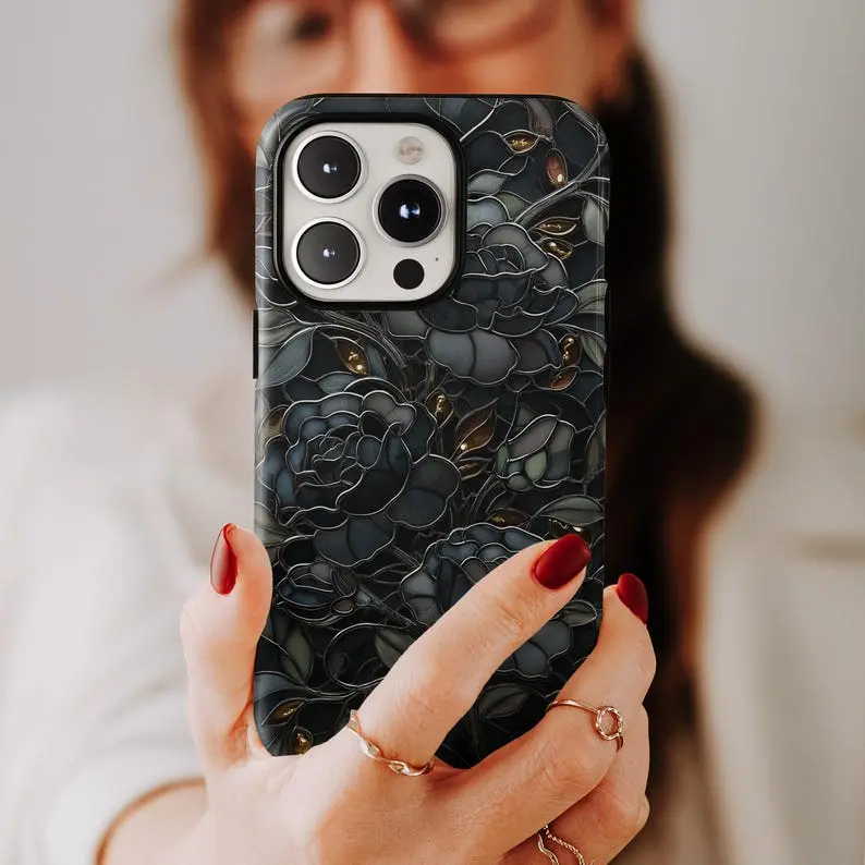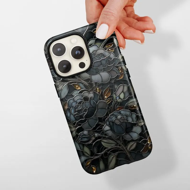 Stained Glass Phone Case, Mosaic Dark Academia Flower iPhone 11 12 13 14 15 16 17