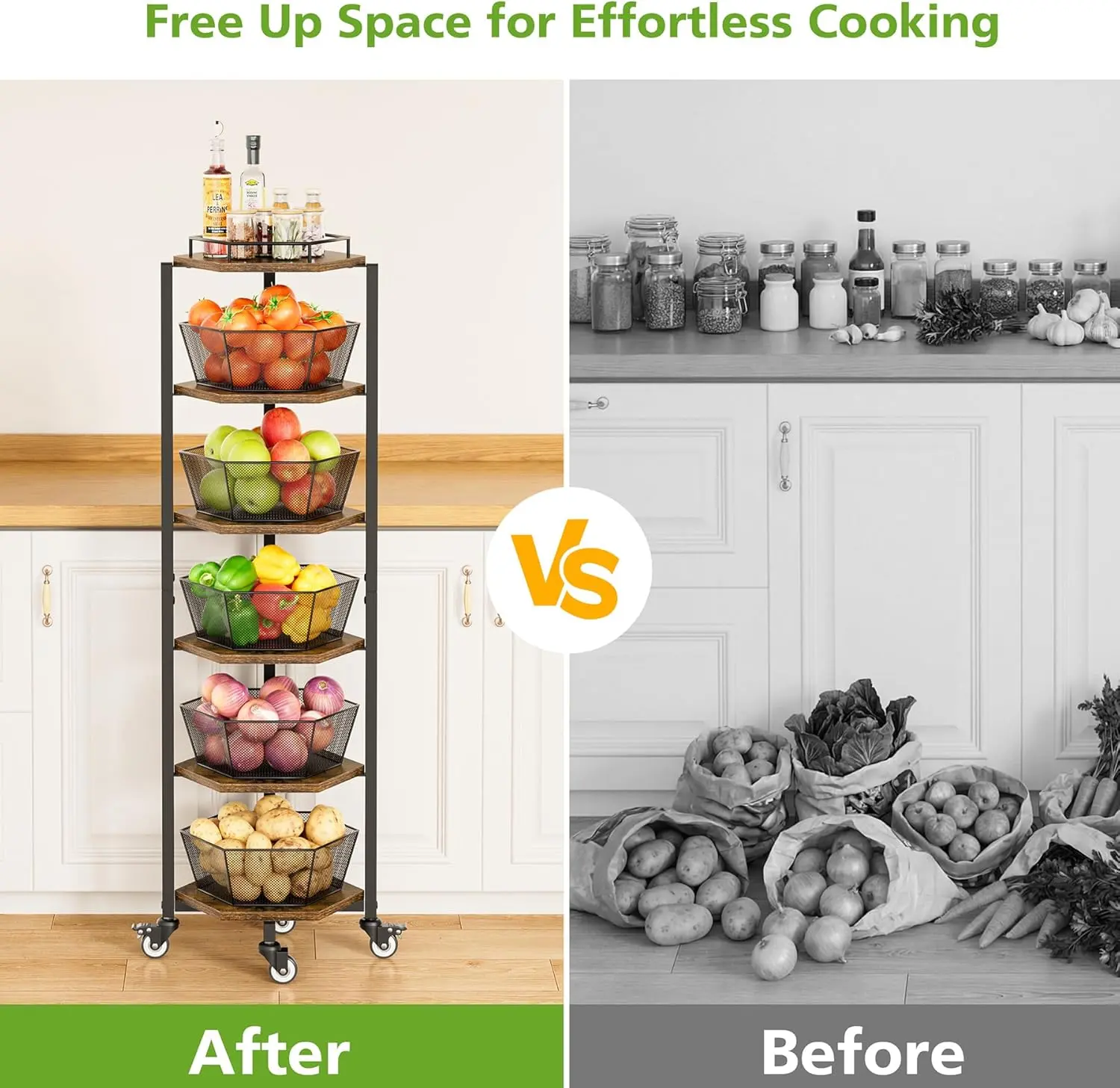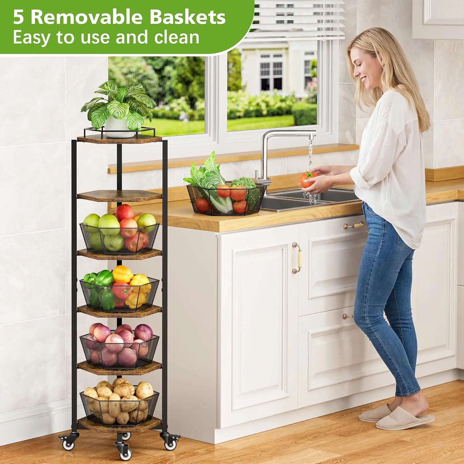 ·【All-in-One Design with Removable Baskets】 This kitchen storage cart comes with five movable fruit baskets, offering generous capacity for vegetable and fruit storage and keep the air circulating. The removable design allows for easy cleaning, ensuring a hygienic and tidy storage space while providing convenient access to your fresh produce.