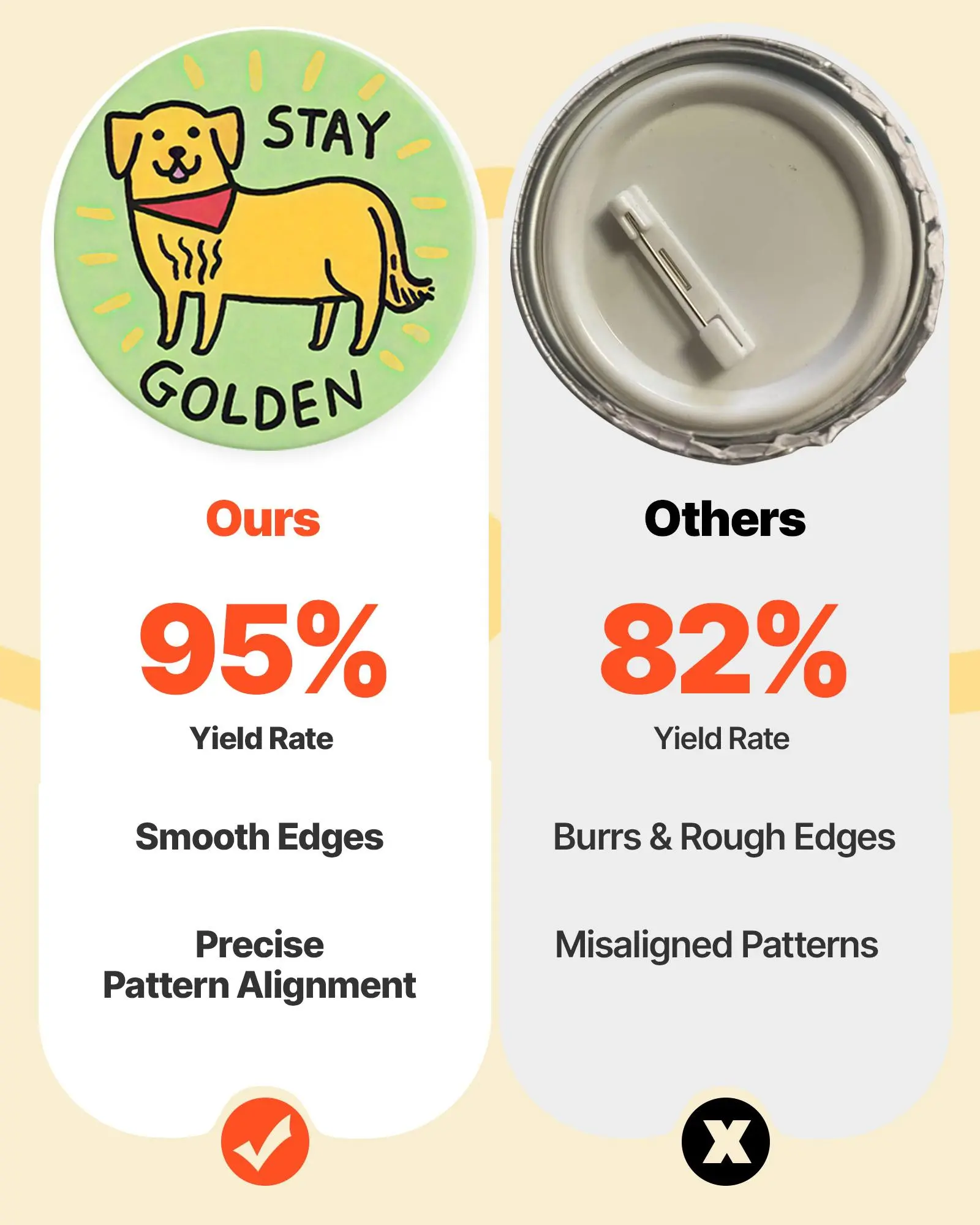 High Success Rate: Precision molds and alignment guides help avoid tilted designs, ensuring ideal outcomes every time. It is recommended to use 127-157g paper (135g performs especially well). Avoid mold shifting while using the button maker machine