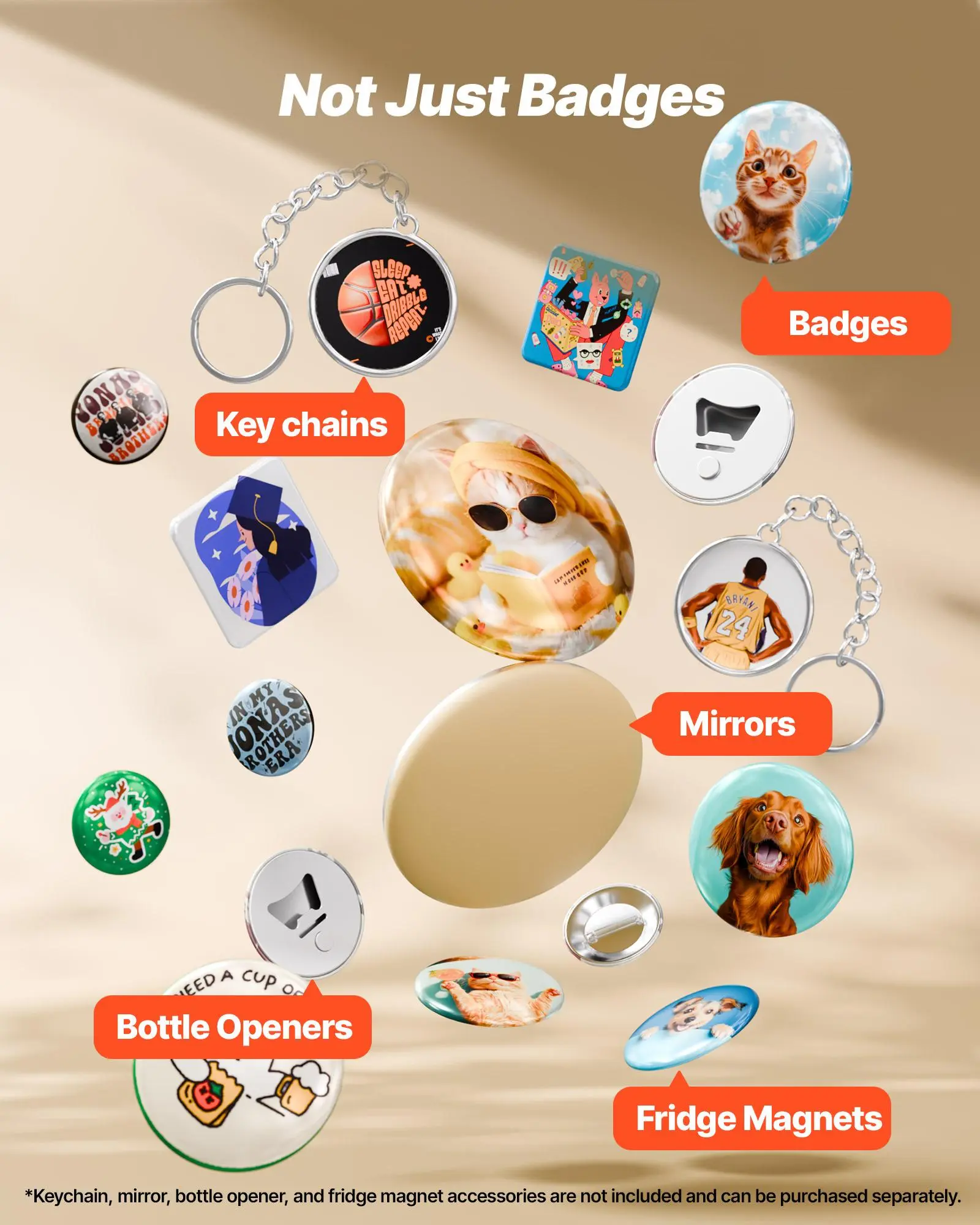 Make Personalized Gifts: Design custom badges for any occasion. Our button making machine also works with mirrors, keychains, bottle openers, and magnets—turn your creativity into one-of-a-kind, heartfelt keepsakes