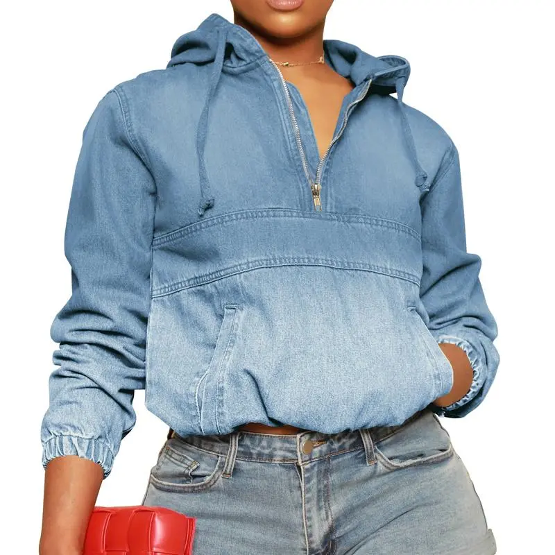 Closure Type:Pull On Size Type:Normal Type Composition:Cotton,polyester fibre Design:Raw Wash Feature:Multi-Function,Foldable,Hangable Clothing Type:Half Zip Hoodie Embellishment:Chain Washing Instructions:Machine Washable Fit:Loose-Fitting Style:Casual,Athletic,Boho,Chic,Elegant,Korean,Cute,Minimalist,Preppy,Retro,Street,Sweet,Holiday,Fashion,Party,Basics,Modest,Classic,OL,Y2K Season:Autumn,Spring,Winter Sleeve length: long sleeve Clothing Length:Medium Neckline:Cowl Neck Occasion:Casual Quantity Per Pack:1 Region Of Origin:China Pattern:Plain Materials:Polyester,Cotton Country of Origin:China About this item [MATERIA]L: The Typical Fabric Used For Lightweight Denim Jacket Hoodie Women Is Cotton, Providing A Blend Of Comfort, Breathability, And Lasting Durability. [DESIGN]: This Thin Women Zip Up Jean Jacket Hoodie Features A Distinctive Drawstring Hood And Half-Zipper, While The Stretchable Cuffs And Waist Elastic Rope Ensure A Comfortable Fit And Unrestricted Mobility. [OCCASIONS]: The Fashion Womens Half Zip Pullover Denim Hoodie Is Versatile For Various Occasions, Offering A Blend Of Casual Comfort And Stylish Flair.It Can Be Worn For Everyday Activities, Casual Outings, And Relaxed Social Gatherings. [MATCHING]: The Cute Womens Hoodies Pullover Presents Limitless Styling Options. Combine It With Distressed Jeans And Sneakers For A Laid-back Feel, Or Drape It Over Sleek Black Leggings And Ankle Boots To Achieve A Sophisticated Urban Look. [SIZE]: Please Refer To The Size Chart Provided In The Image On The Left Or Within The Product Description Section Of The Denim Hoodie For Accurate Sizing Guidance.