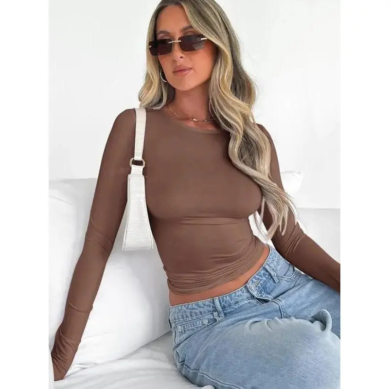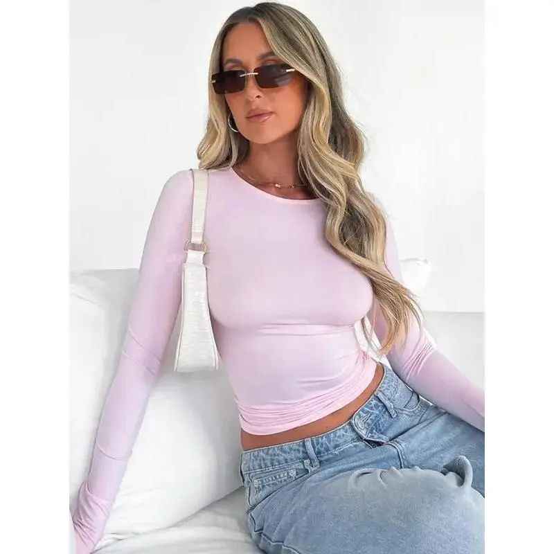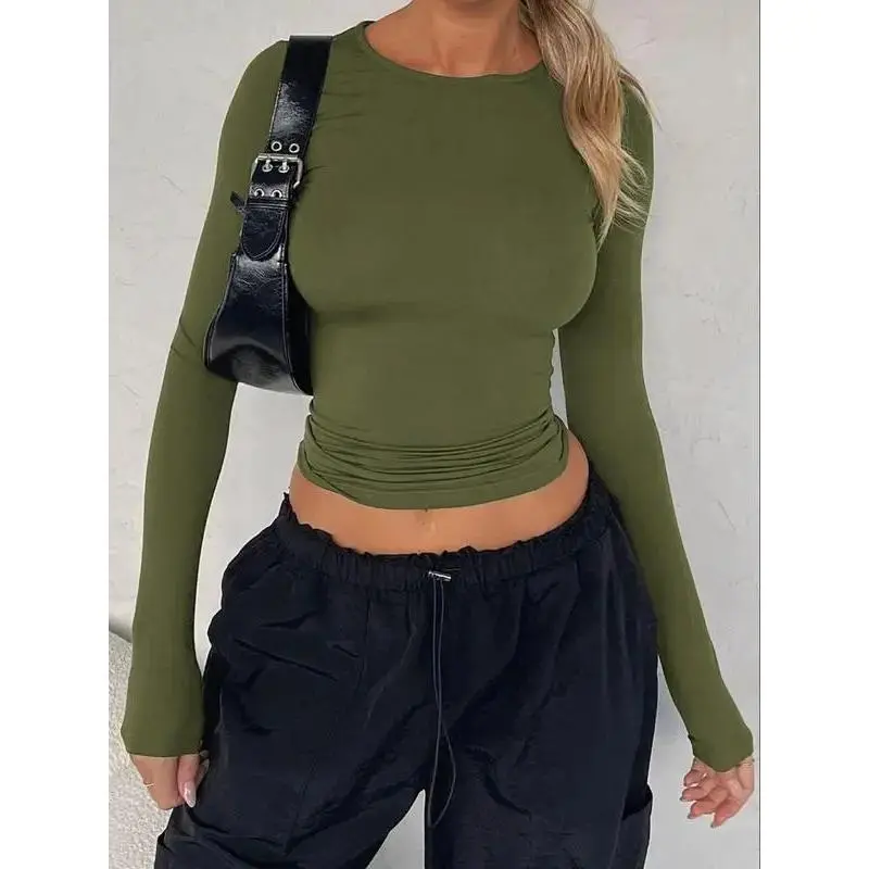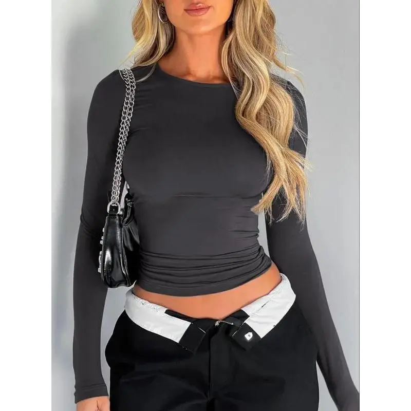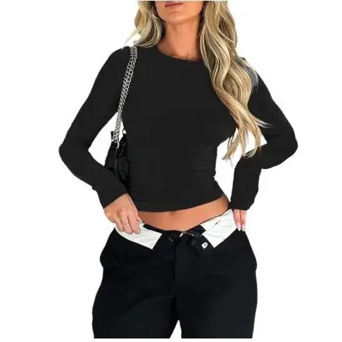 NewWomen's new fashion round neck long sleeve cropped T-shirt, casual round neck T-shirt, 2025 summer clothing, women's slim fit tops, suitable for band club music festival party daily wear