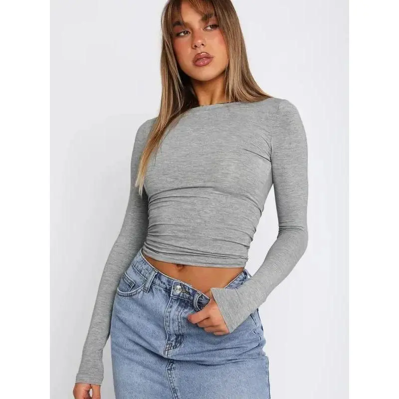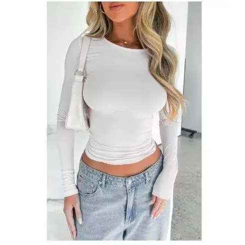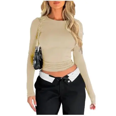 [Round Neck]: The round neck adds a touch of classic elegance to the shirt, making it suitable for both casual and dressier occasions. ·[Versatile Sizing Options]: Available in sizes S, M, and L, this slim-fitting top caters to a range of body types, ensuring a flattering look for women aged 18 to 34. ·[Slim-fitting Design]: This top is designed to flatter your figure, highlighting your curves and creating a sleek and modern look. ·[Effortless Mix & Match]: With its plain pattern and a variety of color options, this crop tee can be easily styled with jeans, skirts, or shorts for a casual, yet trendy look that's for various occasions. ·[Premium Comfort Fabric]: Crafted from a blend of elastane and polyester, this women's new trendy solid round neck long sleeve crop tee offers a soft touch with medium stretch for a comfortable, figure-hugging fit that moves with you.