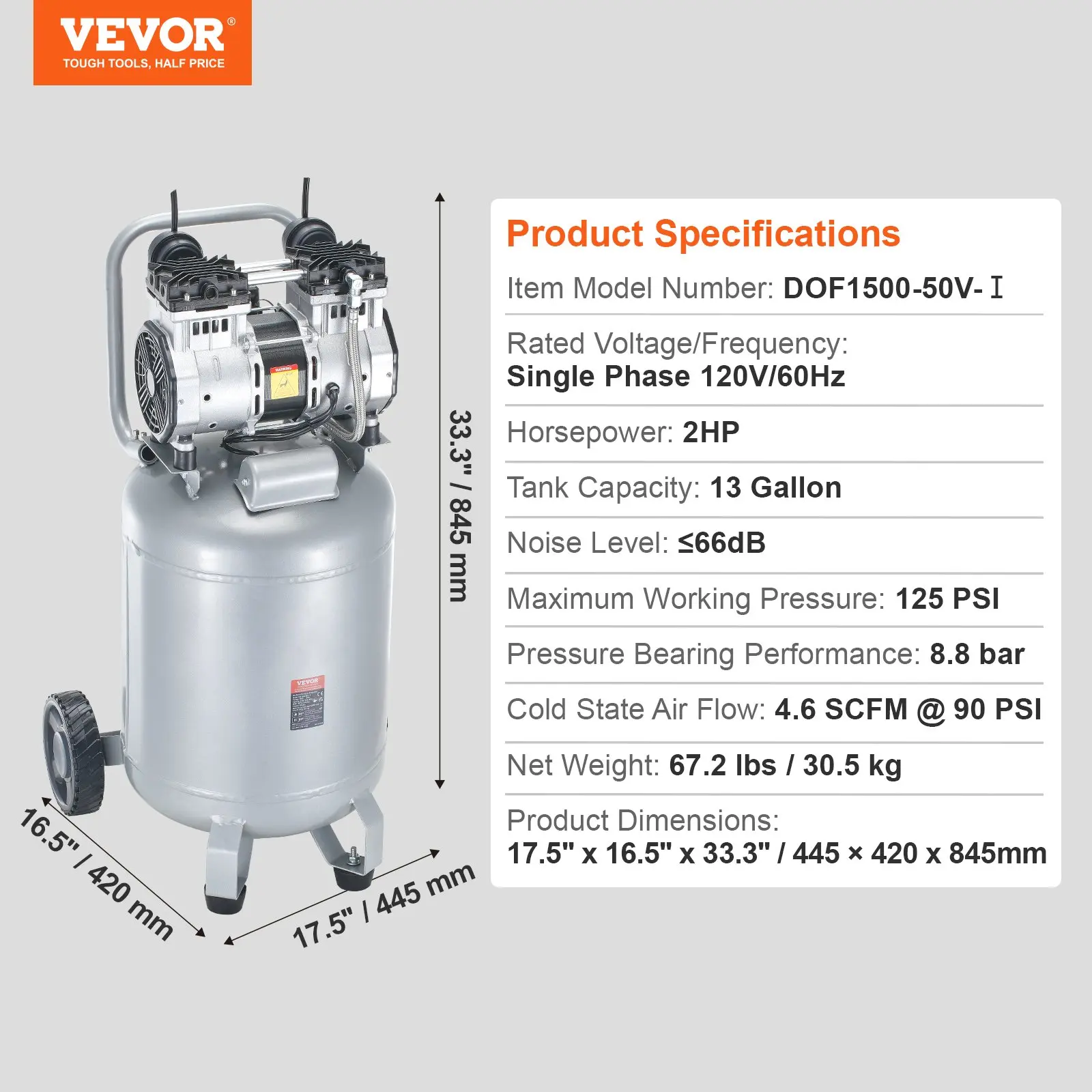 Discover the ultimate efficiency with VEVOR 13-Gallon air compressor. With 2HP powerful motor, 4.6 SCFM90 PSI air delivery, and versatile applications, it delivers robust and efficient air compression, completing various tasks quickly, perfect for tire inflation, auto repair, and woodwork nailing.