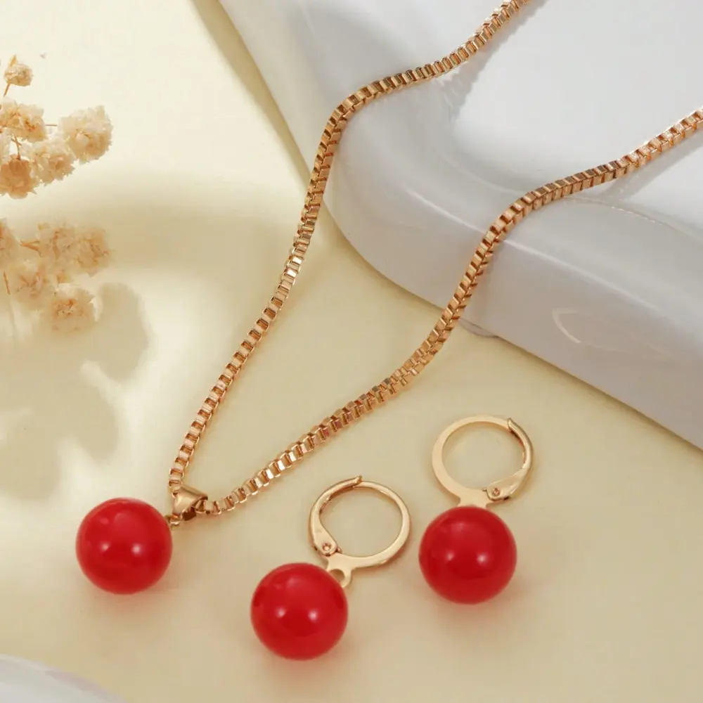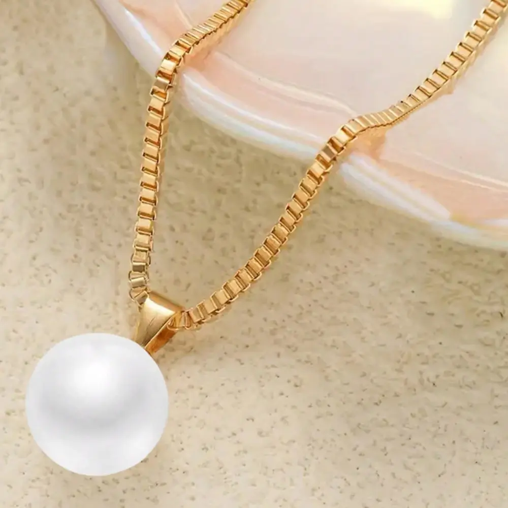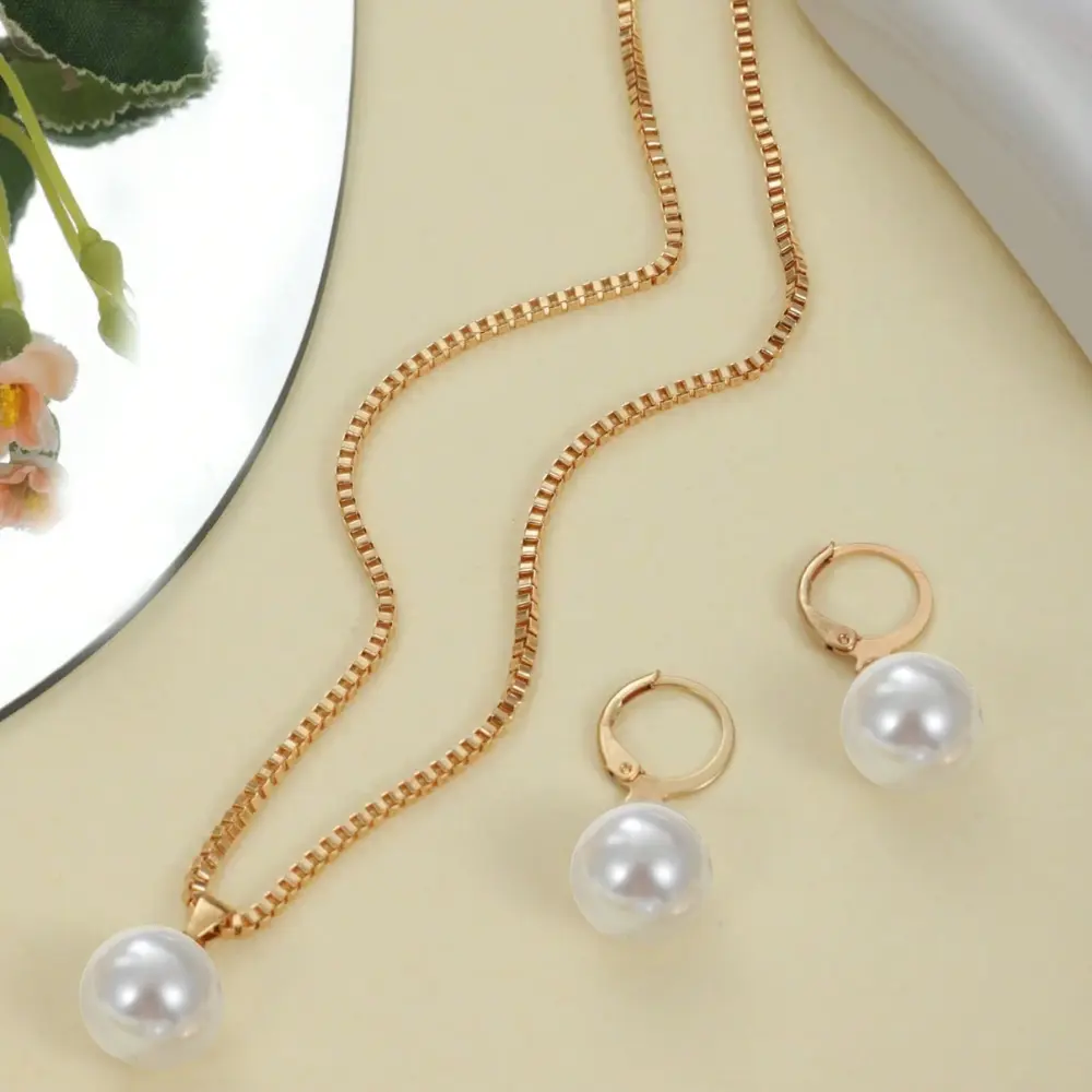 Elegant jewelry set featuring a gold-tone necklace with a pearl pendant and matching earrings. Simple yet stylish design, perfect for everyday wear or special occasions.