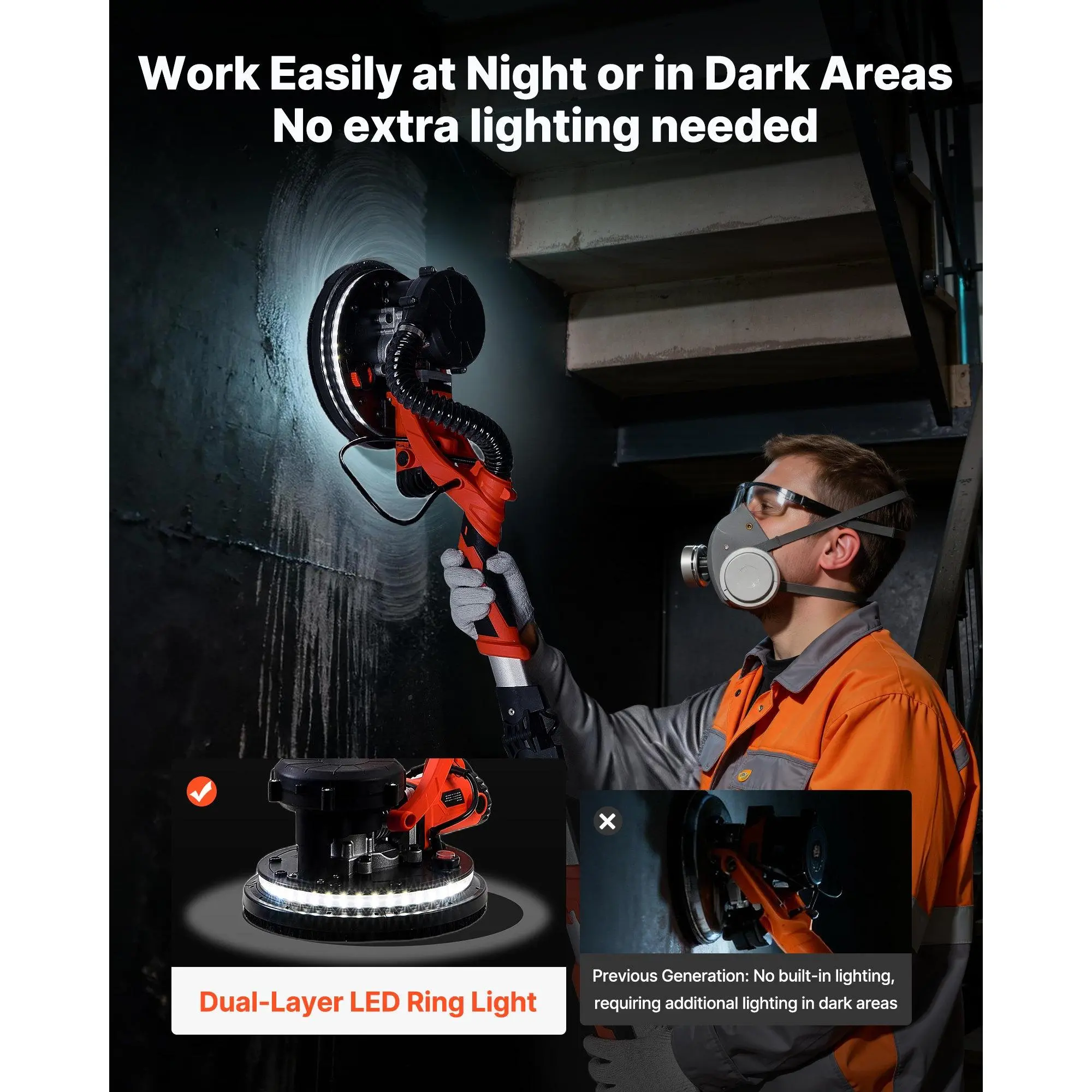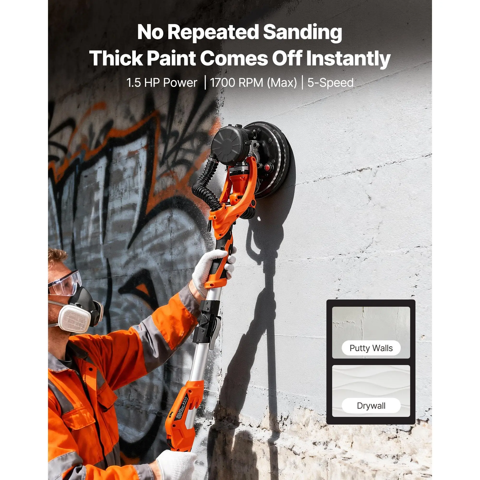VEVOR Drywall Sander, 1150W Electric Drywall Sander, Popcorn Ceiling Removal Tool with Vacuum Dust Collection, 5 Variable Speed 800-1700 RPM, LED Light, Foldable Extendable Handle, 15 Sanding DiscsMulti-Speed Control360 LED LightingDetachable Disc EdgePowerful PerformanceVersatile UseComplete AccessoriesHandle Length: 4.6-5.9 ft/ 1.4-1.8 m, Dust Collection Function: Self-Suction Dust Collection, Product Dimensions (Pole Extended): 70.87x 10.04x 5.51 in/ 1800x 255x 140 mm, Item Model Number: ZL225-MCL, Rated Power: 1.5 HP/ 1150W, Product Dimensions (Pole Retracted): 55.91x 10.04x 5.51 in/ 1420x 255x 140 mm, Speed Range: 5-Speed Control, 800 RPM-1700 RPM, Net Weight: 13.49 lbs/ 6.12 kg, Sanding Pad Size: 8.5 in/ 215 mm