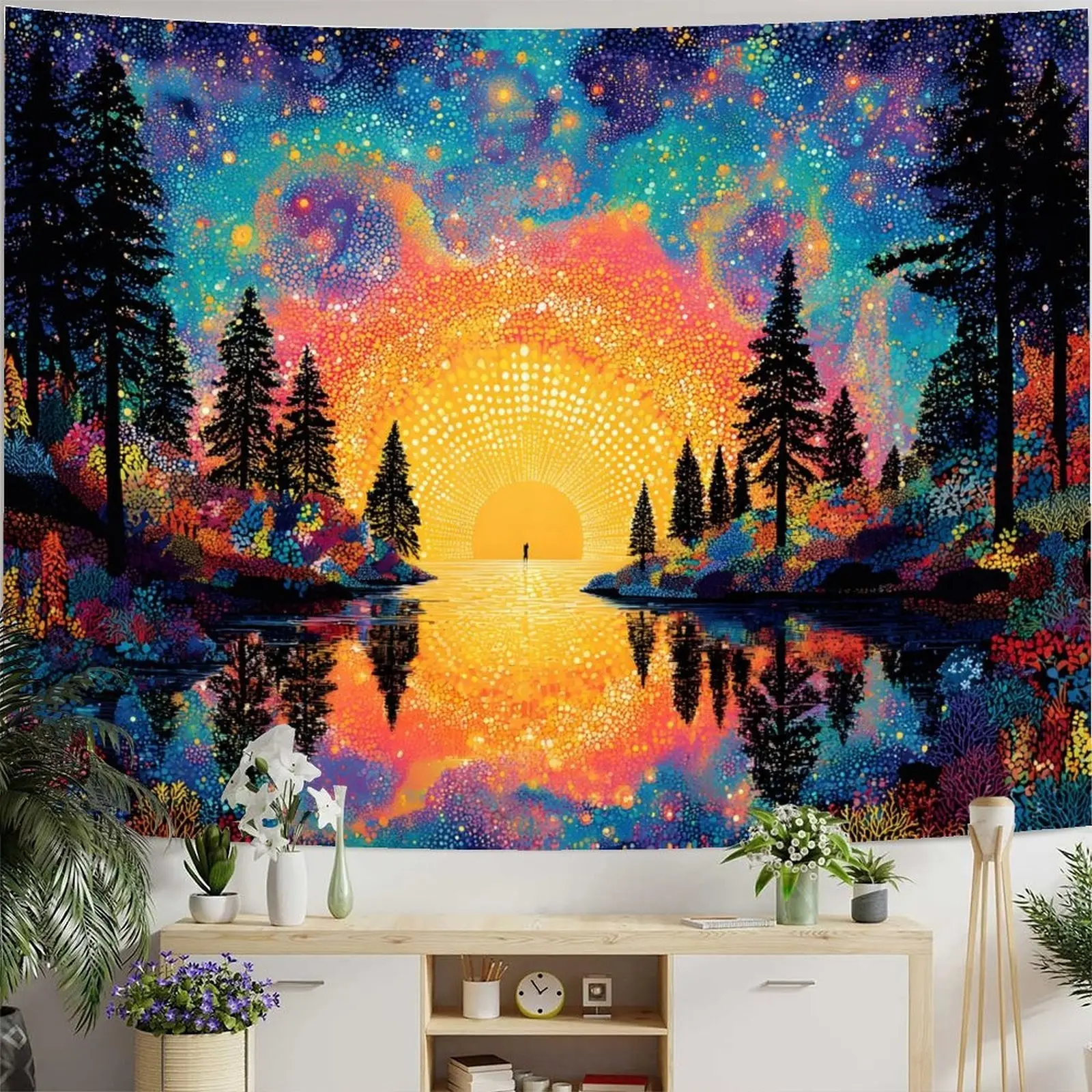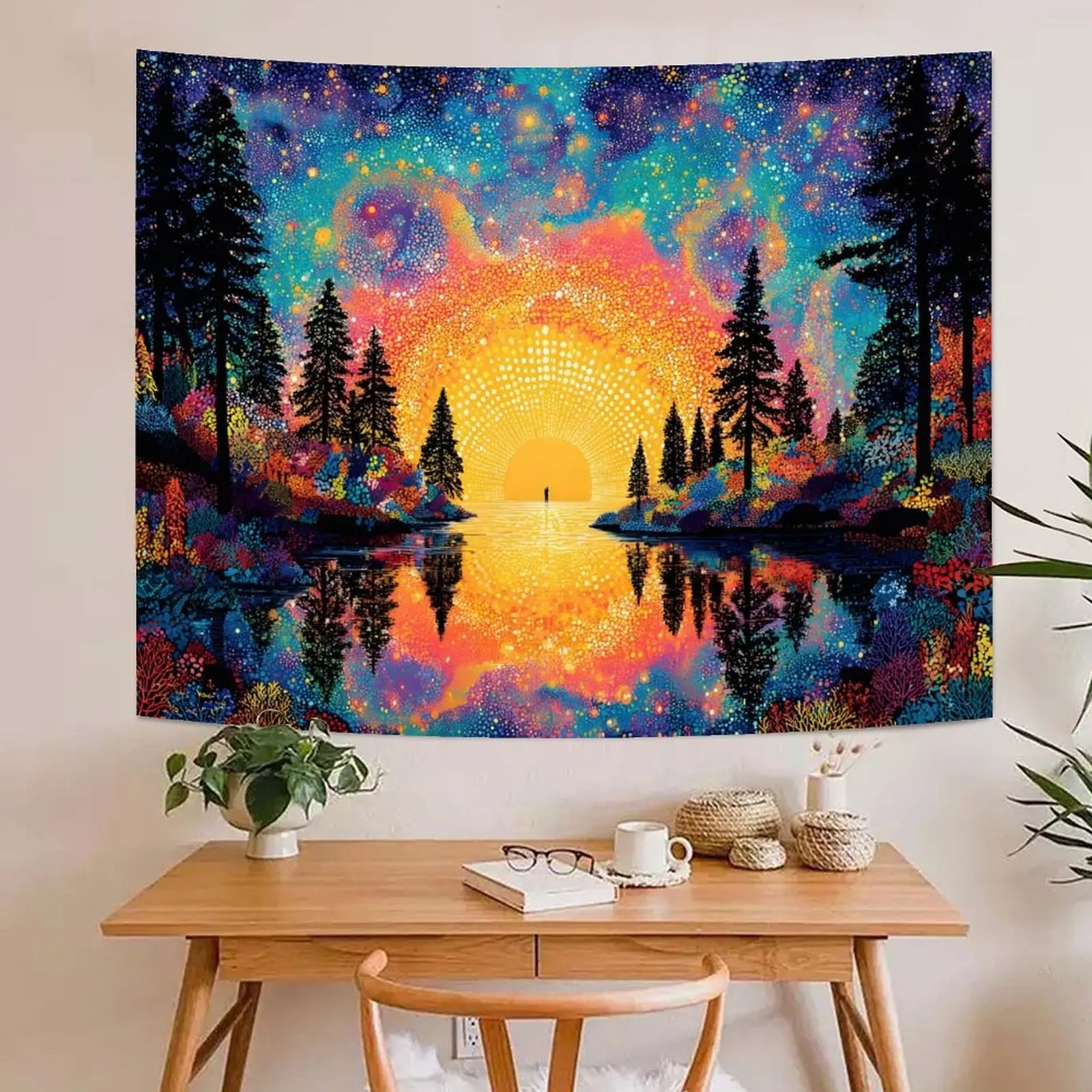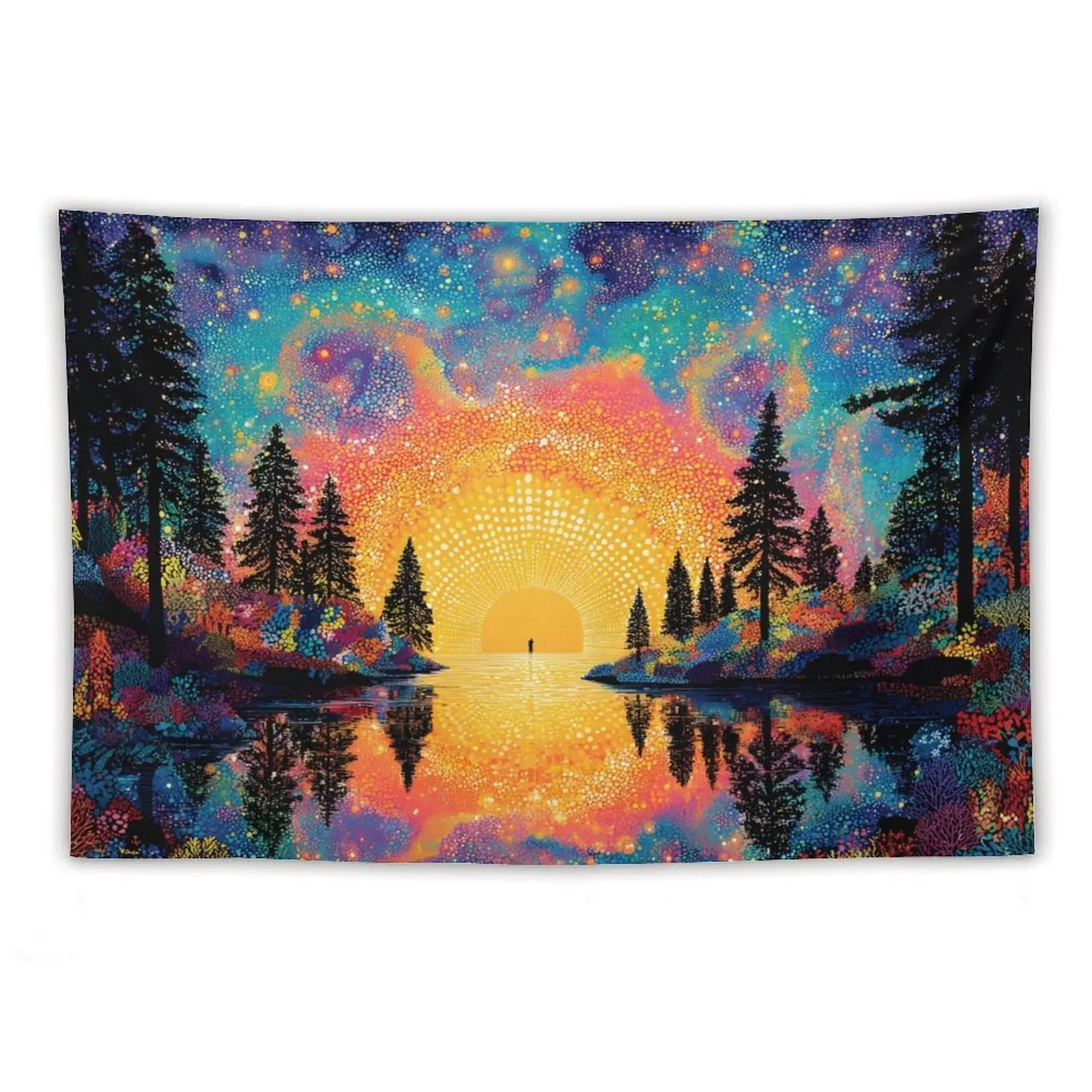 Dilatance effect, sunrise forest lake background fabric for digital printing on polyester wall tapestry, suitable for living room, bedroom, and party decoration.